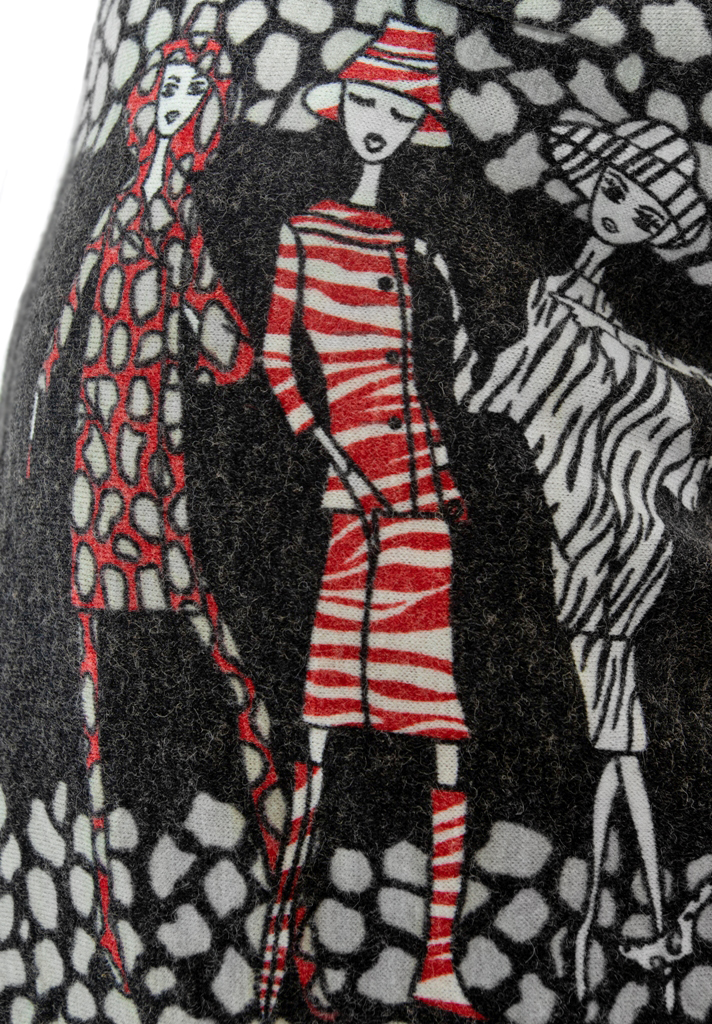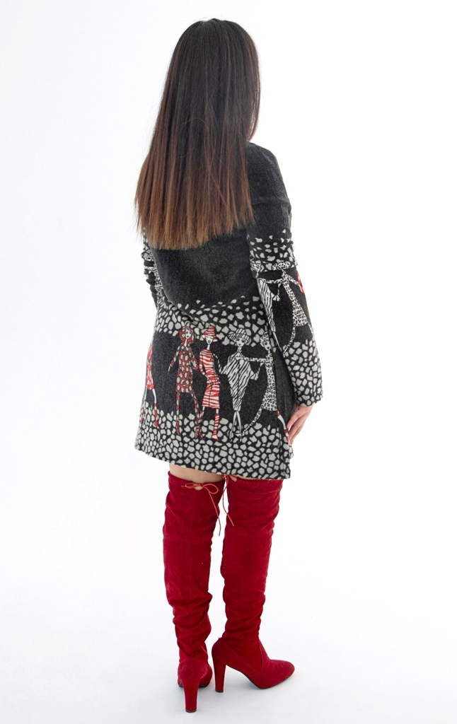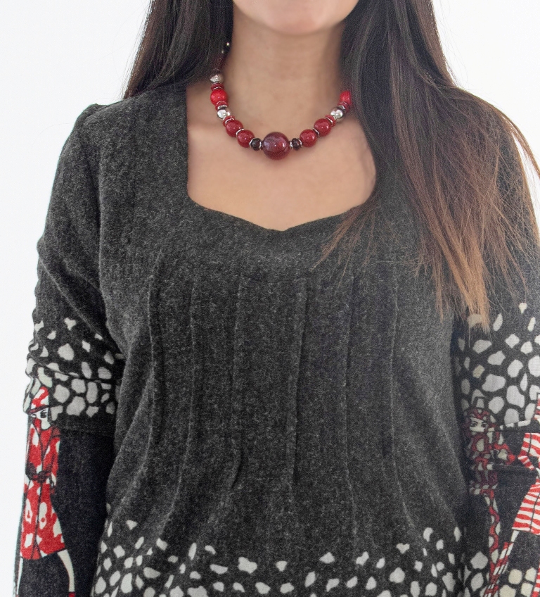 Efektse trükimustriga tumehallist villase ja akrüüli segu peenest lõngast kootud kleit punastest helmestest kaelaehtega. Kleit on trapetslõikeline (alt pisut laienev ja taljesse töötlemata), ees laiad nöörvoldid. Kandilise lõikega kaelus on topeltkangast. Varrukad on üsna pikad ja sirge lõikega.
