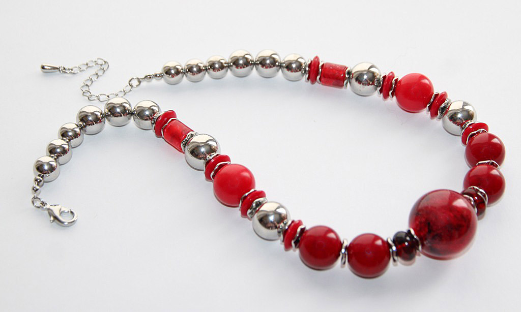 Komplekti kuuluv KAELAEHE on valmistatud erineva suuruse, kuju ja värvitooniga punastest ning läikivatest hõbedavärvi akrüülhelmestest. Kaelaehte pikkus on reguleeritav hõbedavärvi karabiihaagi ja keti abil 44 cm-st kuni 49 cm-ni.