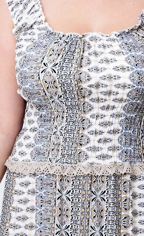 Mustrilisest halli-valgekirjust 100% puuvillakangast pikk suvekleit beežist puuvillapitsist kaunistusega.