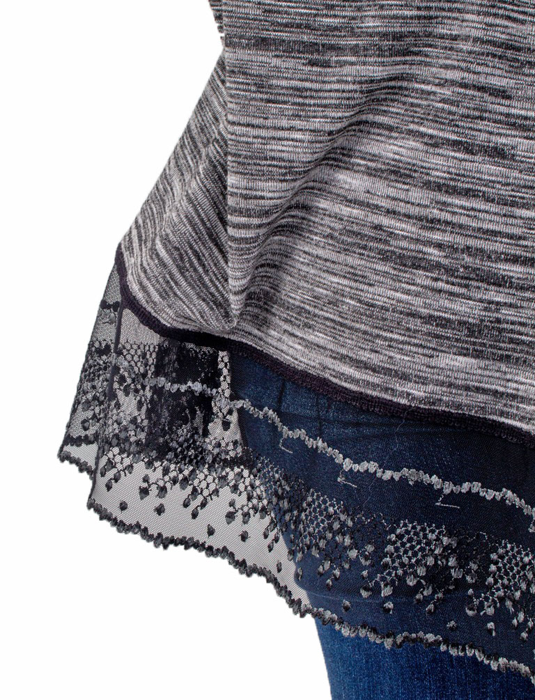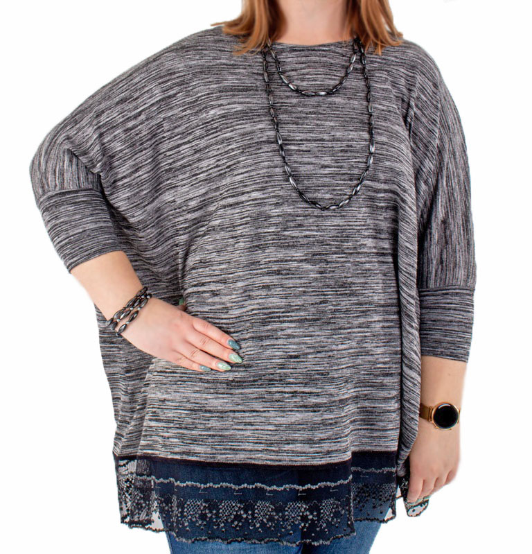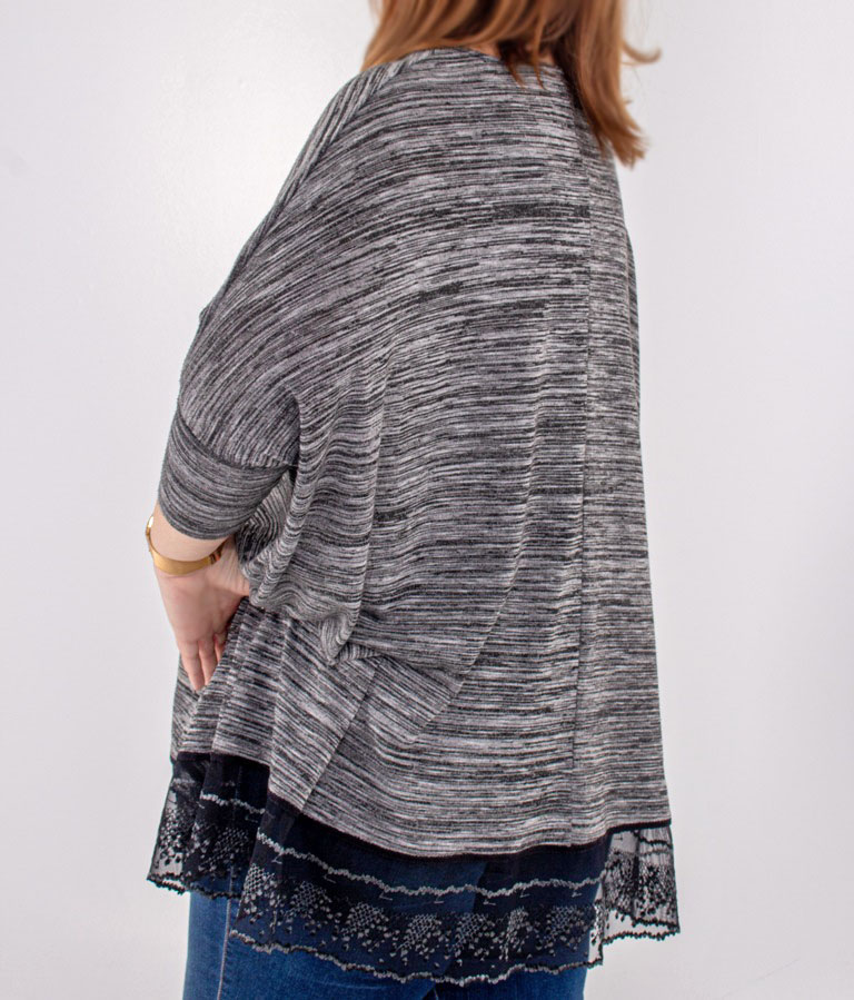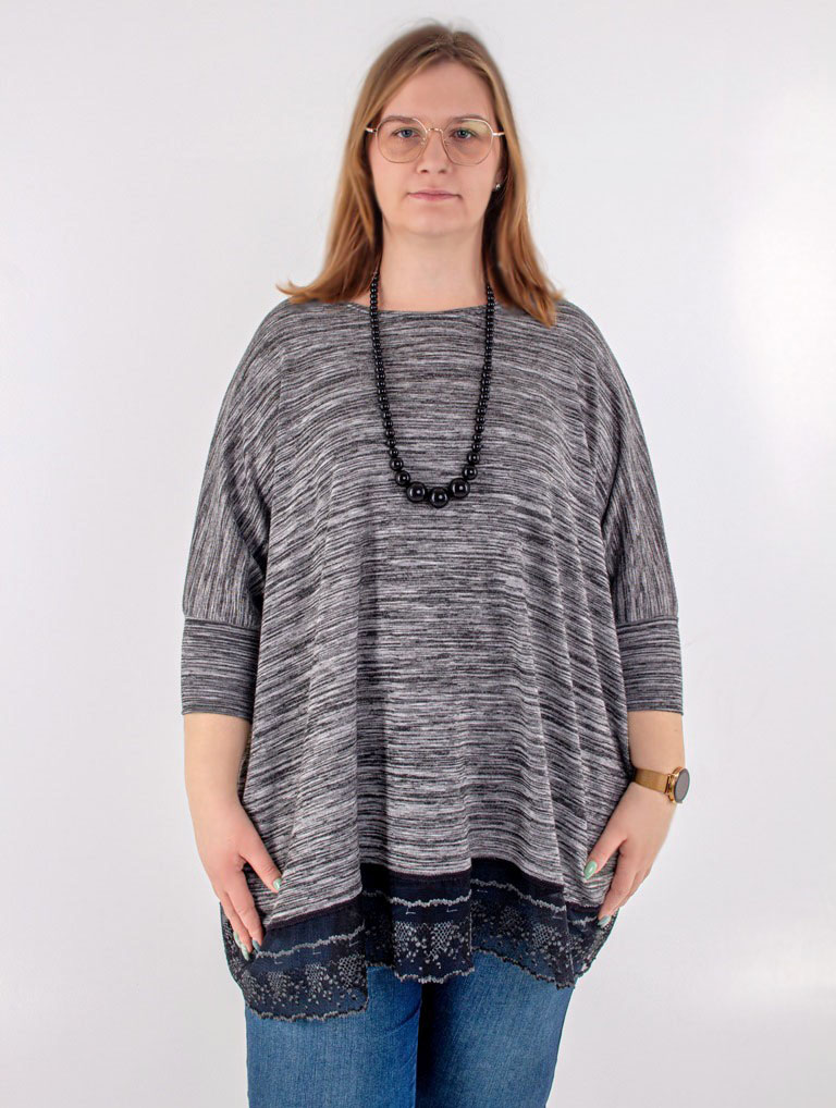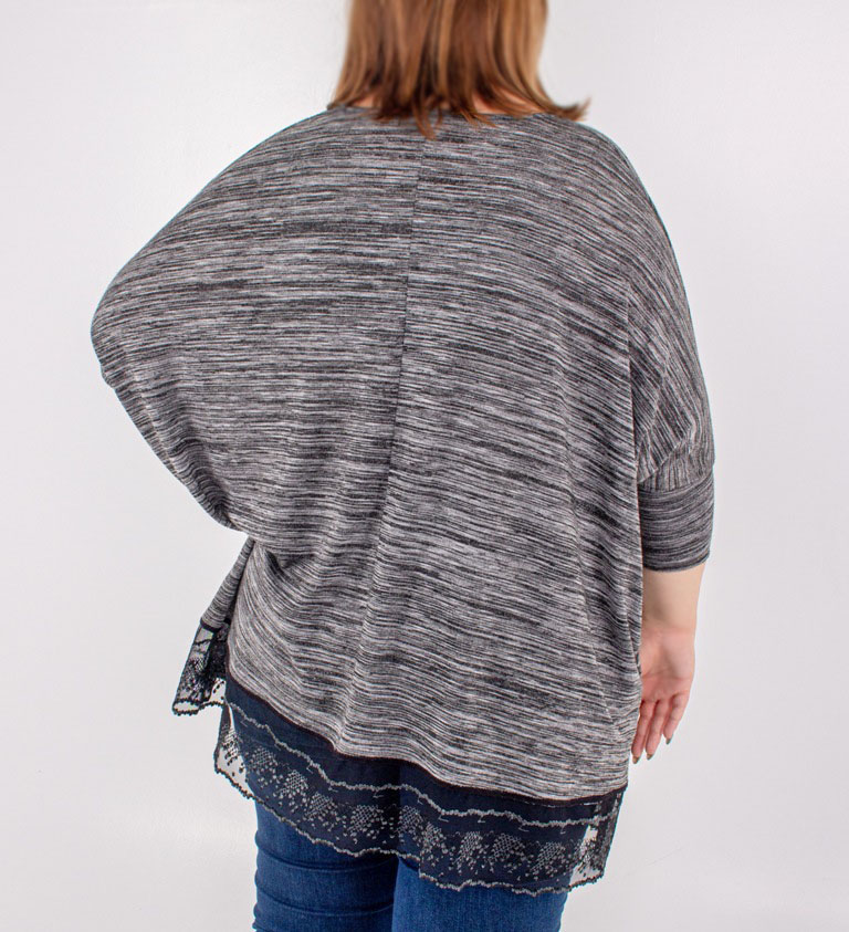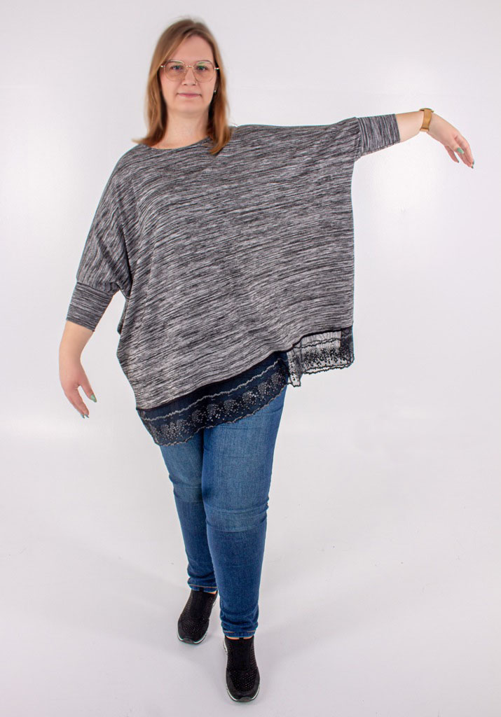 Halli-mustakirjust viskoosi (95%) ja elastaani segu peenkoes trikotaažist efektne kimonolõikeline džemper pitsist allääre ja akrüülhelmestest ehtekomplektiga. Džempri kehaosa on üsna ruudukujuline ning taotluslikult nn over-size mõõduline tekitades külgedele langevad voldid. Laiad mansetid “tekitavad” džemprile kolmveerandpikkuses varrukad, varrukasuu ümbermõõduks on 26 cm. Džempri allääres on kaunistuseks õhuke halli-mustakirju lai polüesterpits.