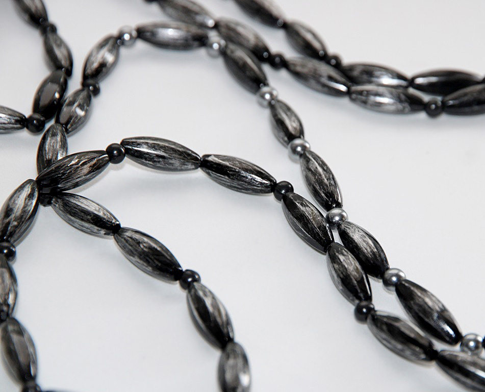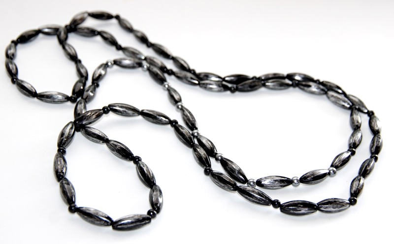 Džempriga komplekti kuulub halli-mustakirjutest hõbedaläikelistest piklikest akrüülhelmestest ja väikestest mustadest ja hallidest pärlitest kolm käevõru ning pikk (üle pea käiv) kaelakee. Käevõrusid saab kanda kas komplektina koos (suurused on 21cm-22cm-23cm) või üksikult. Kaelakee (täisringi) pikkus on 160 cm ja seda saab kanda nii ühekordselt kui ka mitmekordselt ümber kaela “kerituna”.