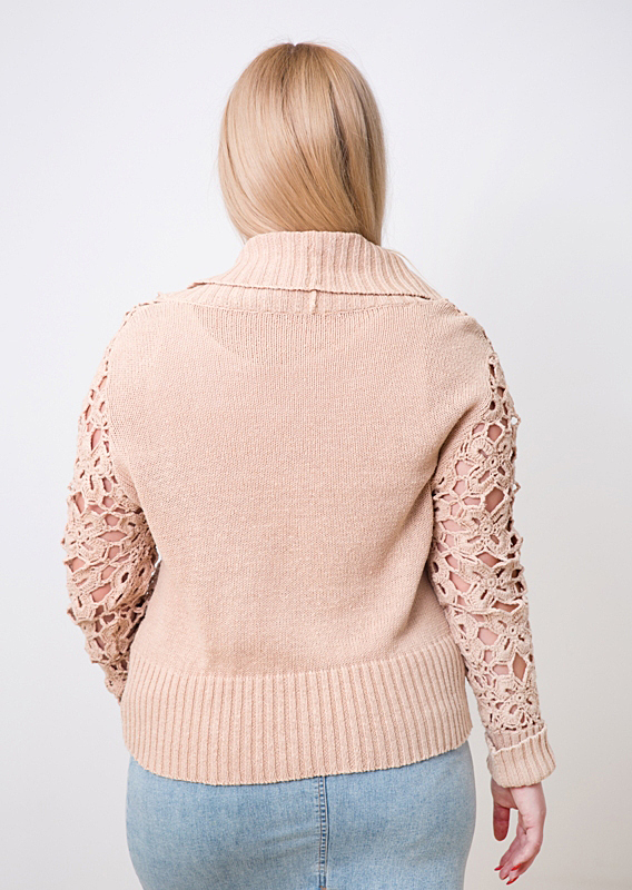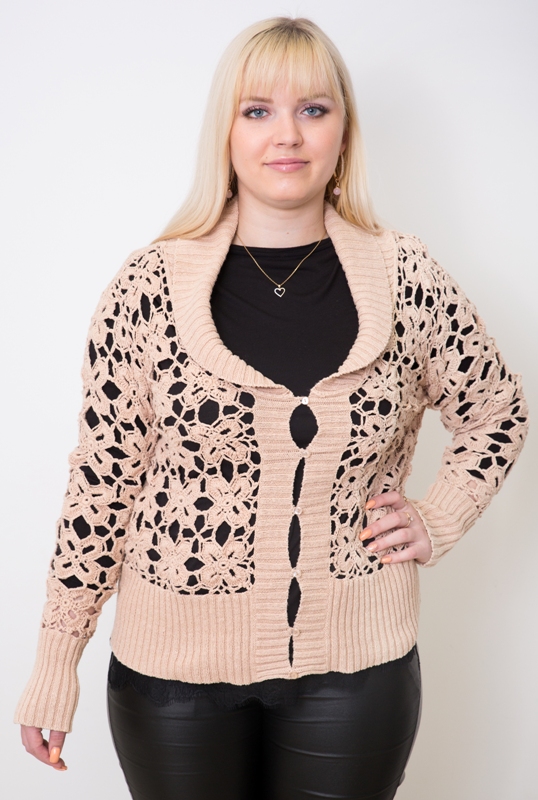 Helebeežist puuvilla (48%) ja linase (52%) segu paksemat sorti lõngast pikkade varrukatega pitskampsun. Kampsuni lillemustriline esiosa ja varrukad on heegeldatud iiri pitsi tehnikas, seljaosa silekoes (masinkootud). Kaeluses soonikkoes tagasikeeratav krae. Ees, allääres ja varrukaotstes lai soonik. Kampsun on eest üleni nööbitav. Kampsun on H-lõikeline (taljesse töötlemata).