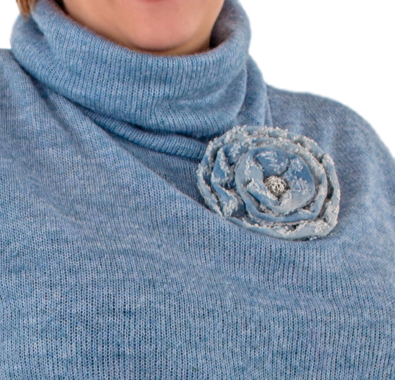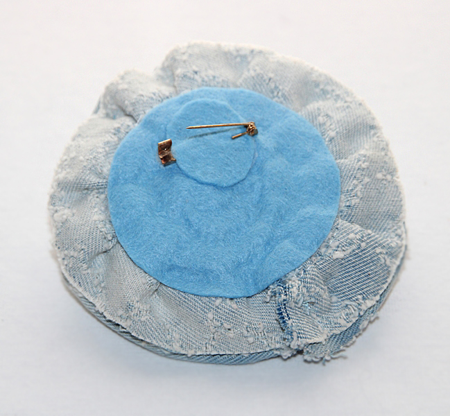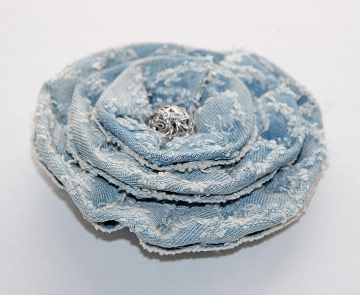 Tugevast pleegitatud ja narmastatud teksakangast lilleõiekujuline pross hõbedase traadipõimingus südamikuga.