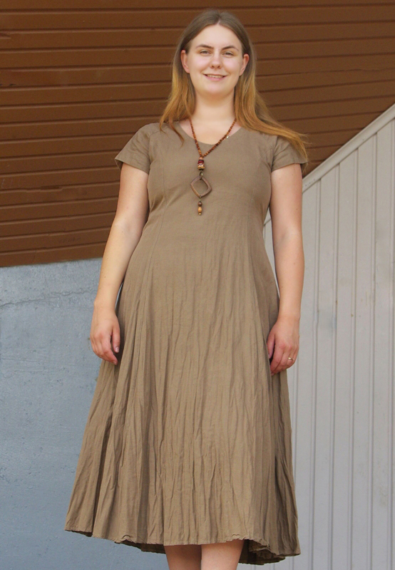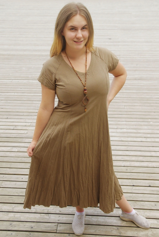Hästi vormihoidvast paksemat sorti 100% linasest kangast väikeste raglaanvarrukatega pikk suvekleit puuhelmestest kaelakeega.