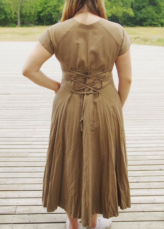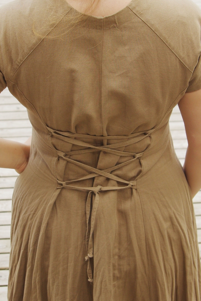 Seljaosa õmbluste vahel on väikesed aasad. Läbi aasade saab peenikese kangast vööga taljekohta nn korseti stiilis sobivaks reguleerida. Kleit on ilma voodrita.