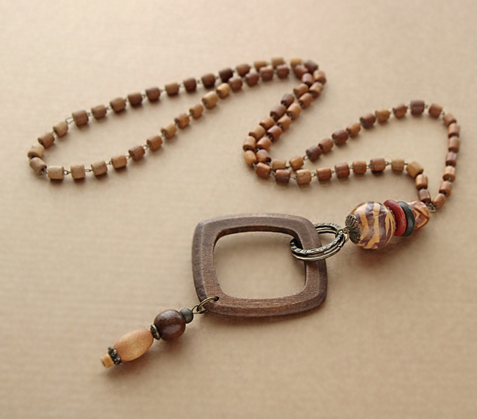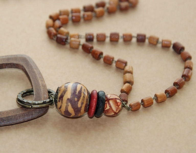 Komplekti kuuluva erinevatest puuhelmestest käsitööna valminud kaelakee ümbermõõt (täispikkus ilma ripatsita) on 76 cm, ripatsi pikkus on 18 cm.