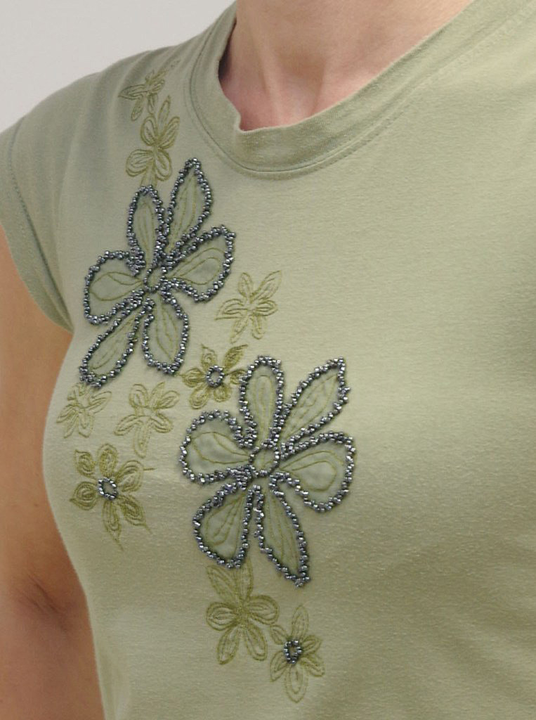 Esiosa tikandil on kaunistuseks kasutatud rohekas-halle säravaid seemnehelmeid.