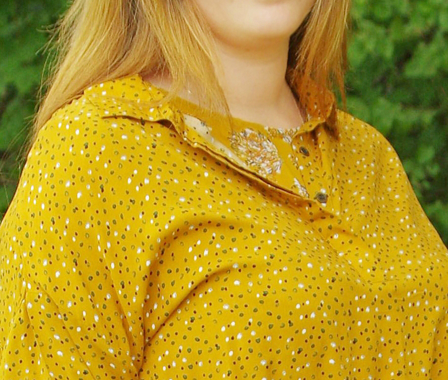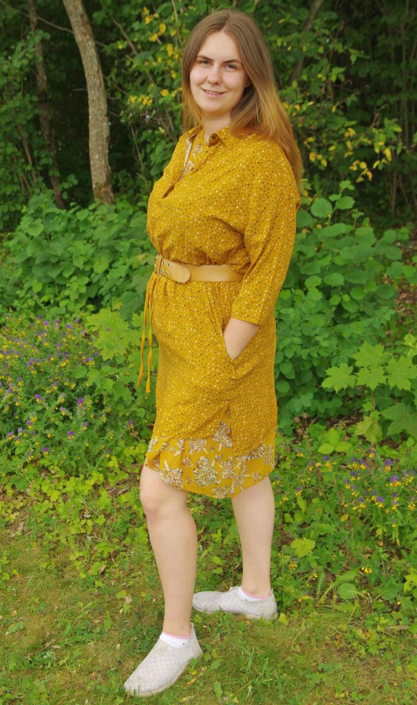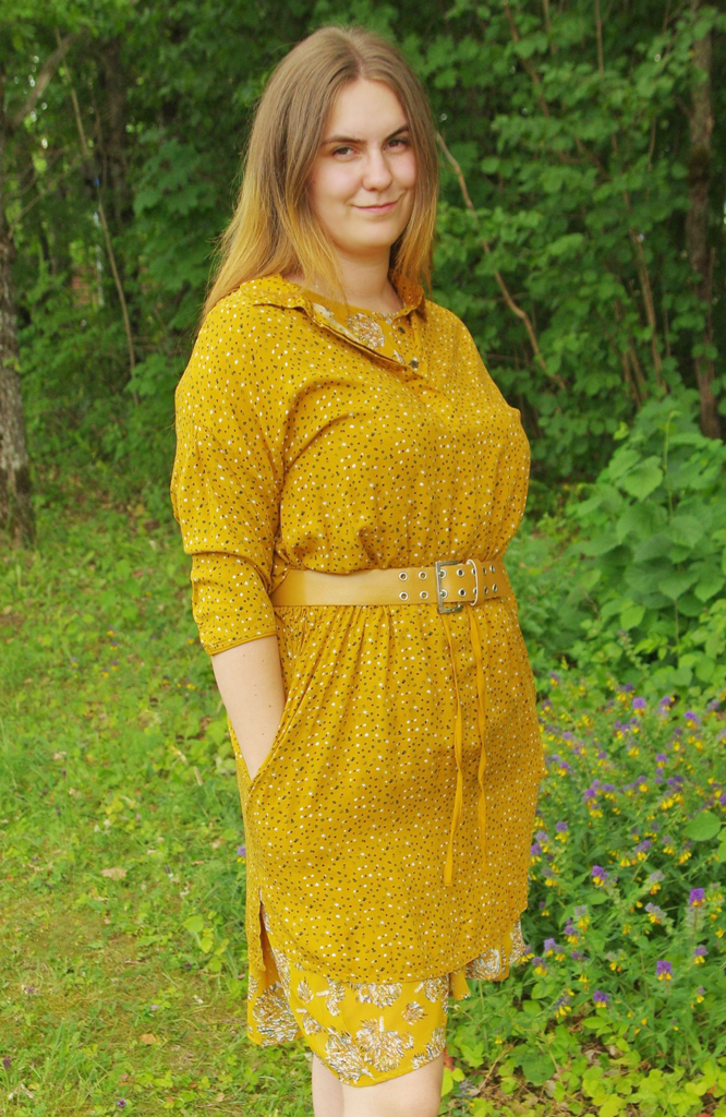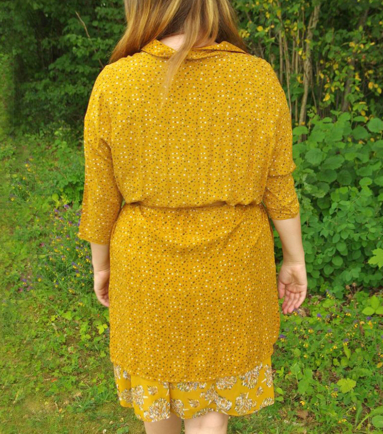 Pealkantav pikendatud õlaosa ja kolmveerandvarrukatega tuunika on sirgelõikeline, vöökohal kanalis kummipael ning peenike sinepikollasest kangast vöö. Külgedel sisseõmmeldud taskud ja väikesed lõhikud. Seljaosa pisut esiosast pikem. Kaeluses teravate nurkadega krae, ees peidetud nööbiliistu all väikesed pronksivärvi metallnööbid (nööbid on lahtikäivad).