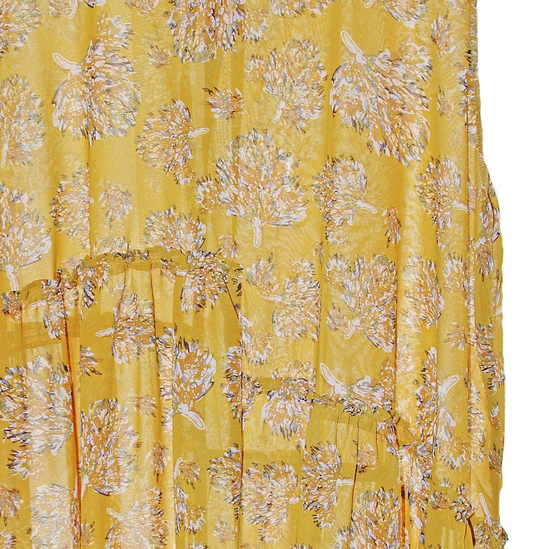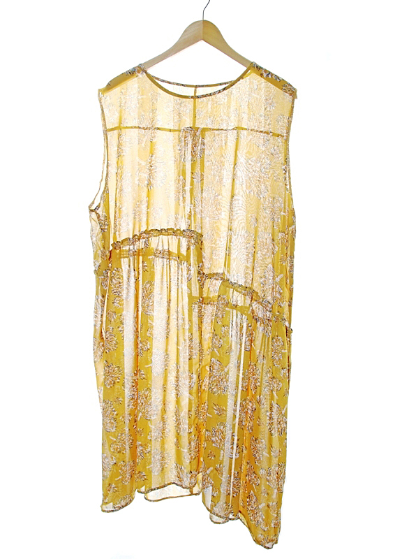Ümara kaeluse ja ilma varrukateta allkantav õhuke lillemustriline tuunika on üsna lai, alumine osa erinevale kõrgusele õmmeldud (kergelt kroogitud) ristkülikukujuliste paanidega.