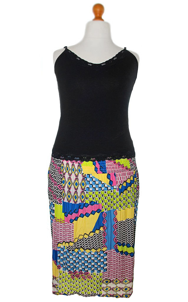 Kahest abstraktse mustriga ühesugusest erksavärvilisest puuvillasest kangast (sitsist) suvekomplekt musta puuvillase särgiku ja erkroosa pitsilise kaelaehtega.