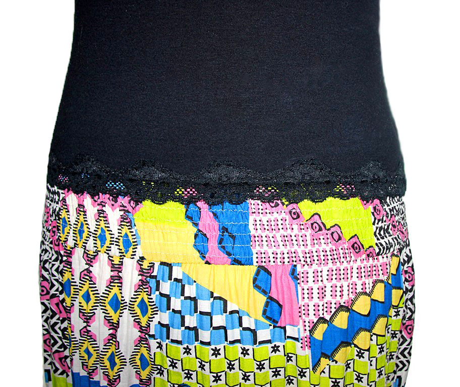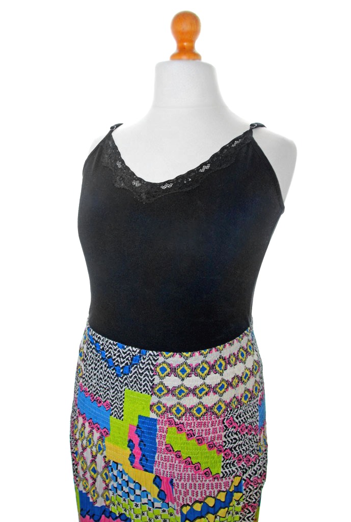 Komplektis oleva musta särgikuga saab ühte seelikut kanda midipikkuses. Puuvillase ja elastaani segu mustal särgikul on reguleeritava pikkusega õlapaelad, allääres ja V-kaeluses venivast stretšist kaunistuspits. Särgikut saab kanda nii seeliku sees kui ka peal. Seelikud on ilma voodrita.