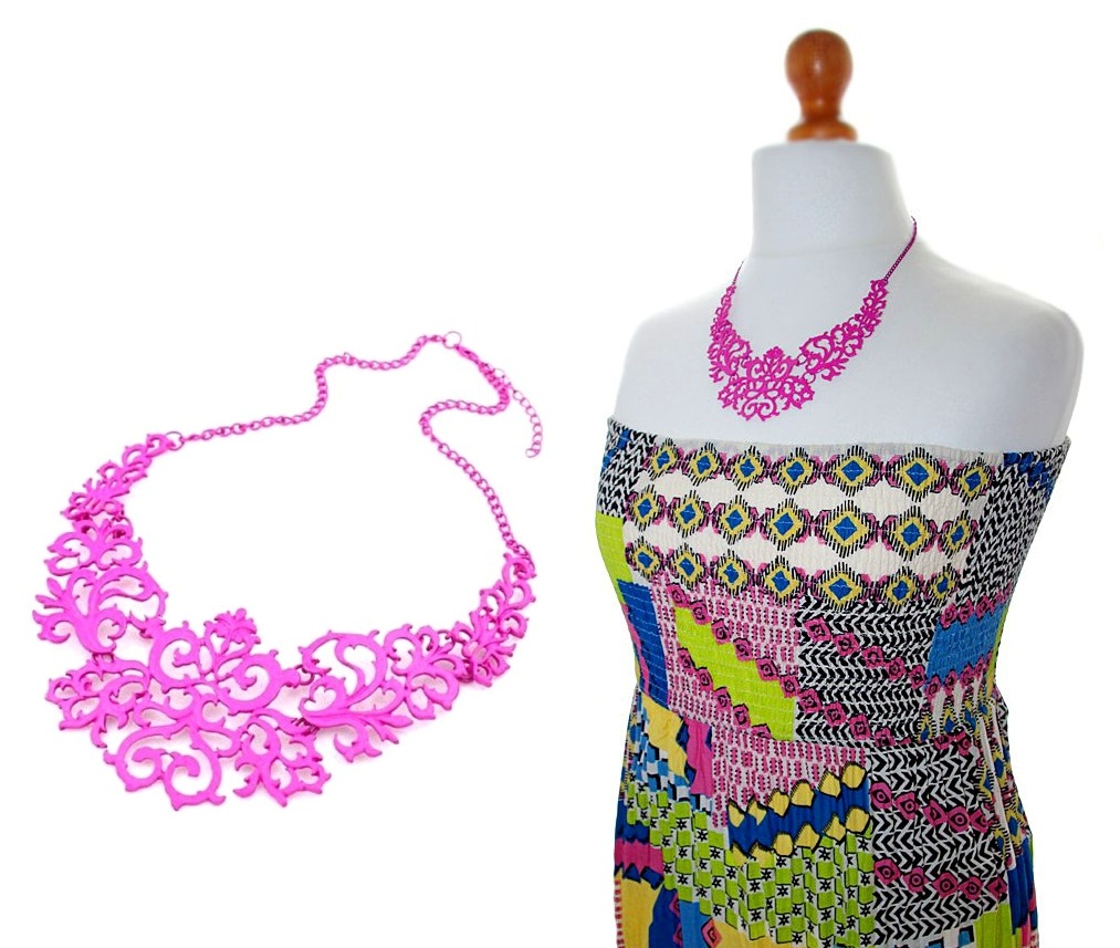 Komplekti kuuluva erkroosa pitsiliste metalldetailidega kaelaehte keskmise detaili kõrgus on 6 cm. Kaelaehte maksimaalne pikkus on 47 cm. Et väikest kinnitushaaki on võimalik kinnitada igasse ketilülisse, siis saab kaelaehet kanda ka choker-stiilis ümber kaela.