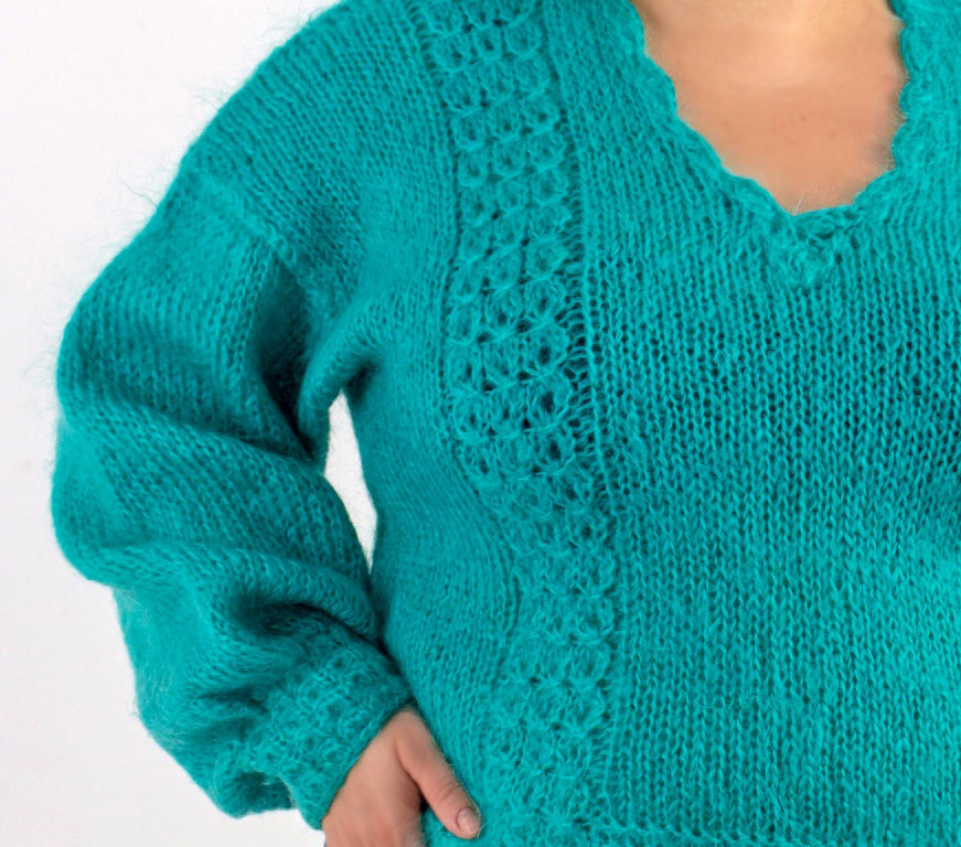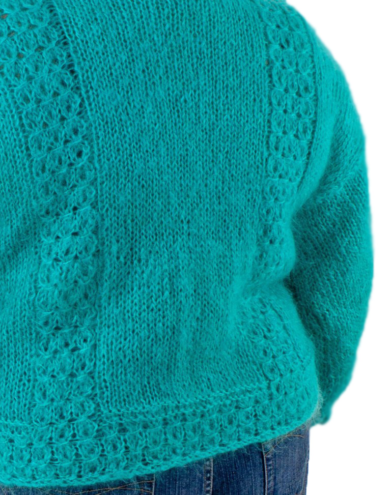 Türkiisivärvi angooravillasest lõngast käsitsi kootud pehme ja soe kampsun. Kampsun on kootud suurte varrastega silekoes ning on seetõttu kohev ja pehme. Esi- ja seljaosal palmikutega koekirjas pikitriibud. Palmik-koes on ka kampsuni varrukaotsad ning alumine äär. V-kaeluses heegeldatud kitsas kaunistusriba.