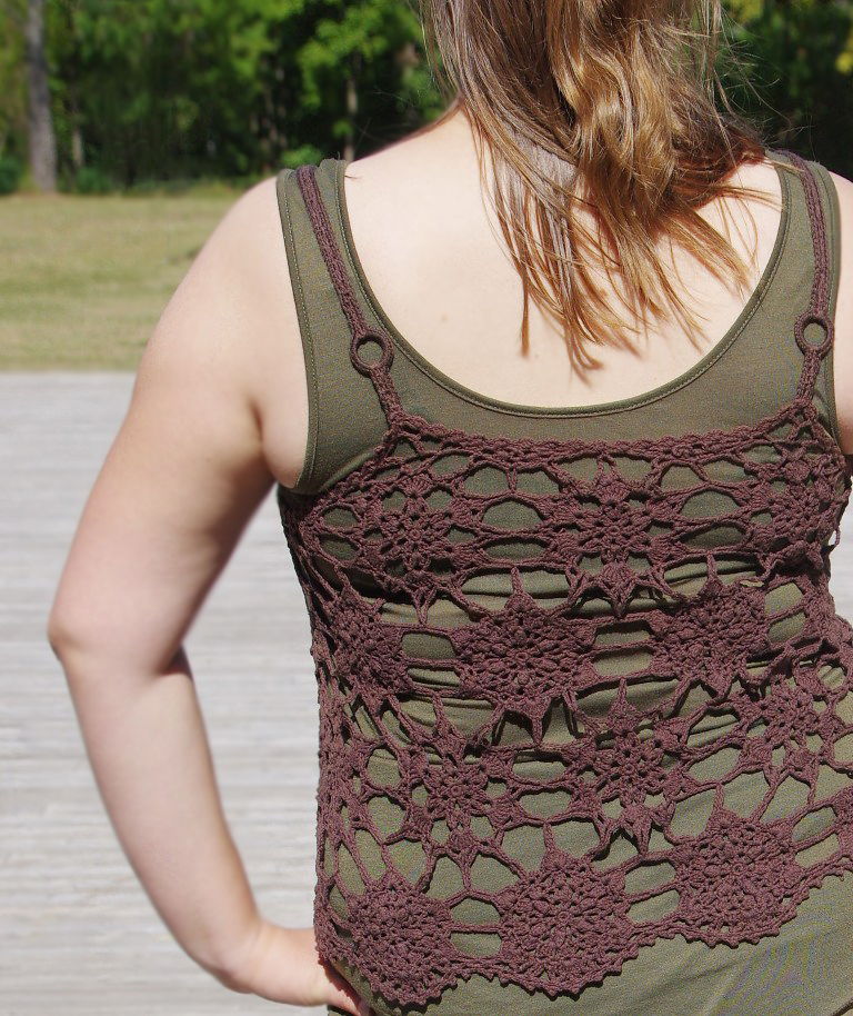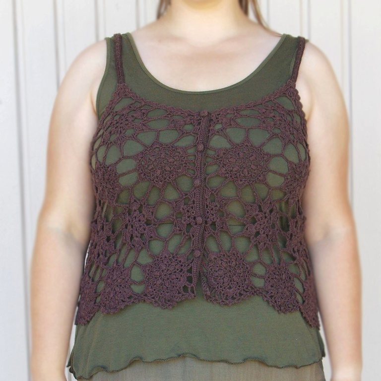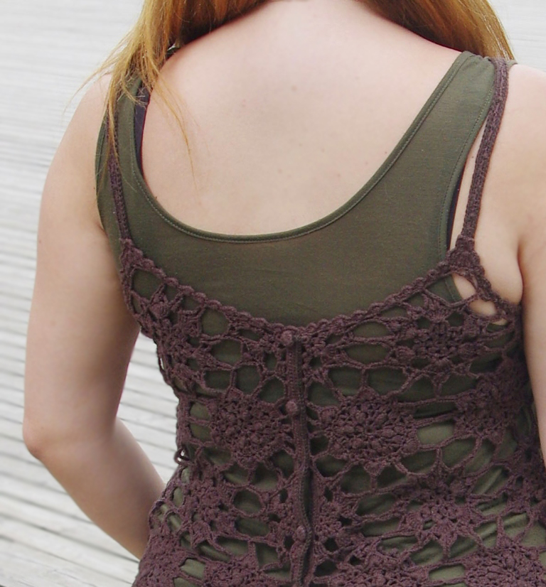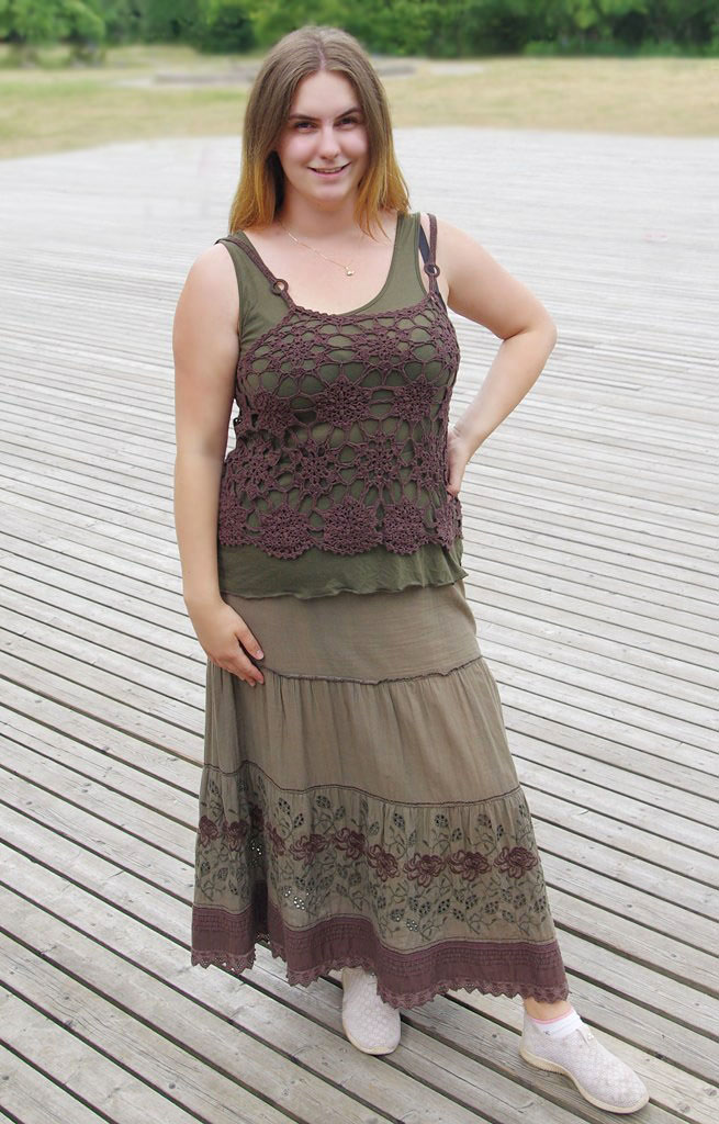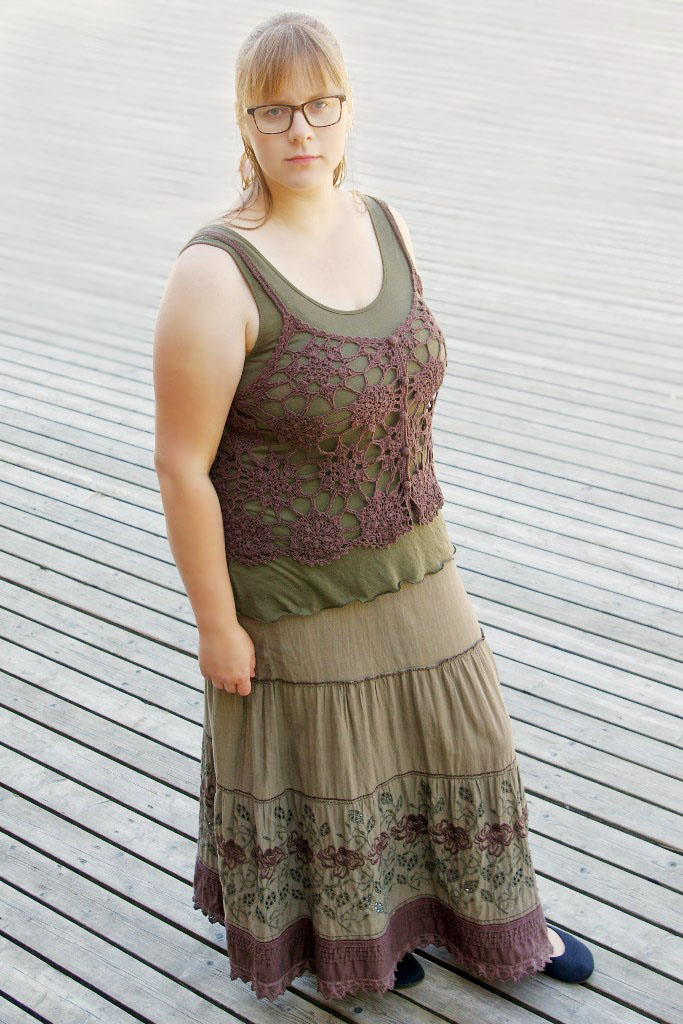 Kleidi peale käib heegeldatud kitsaste õlapaelte ja kaunistusnööpidega (ei ole avatavad) tumepruun heegeldatud vest. Vesti saab vahelduse mõttes kanda mõlemat pidi ehk nii nööbirida ees kui nööbirida seljal (võrdle erinevate modellidega tootepilte vesti erineva kandmisviisiga).
