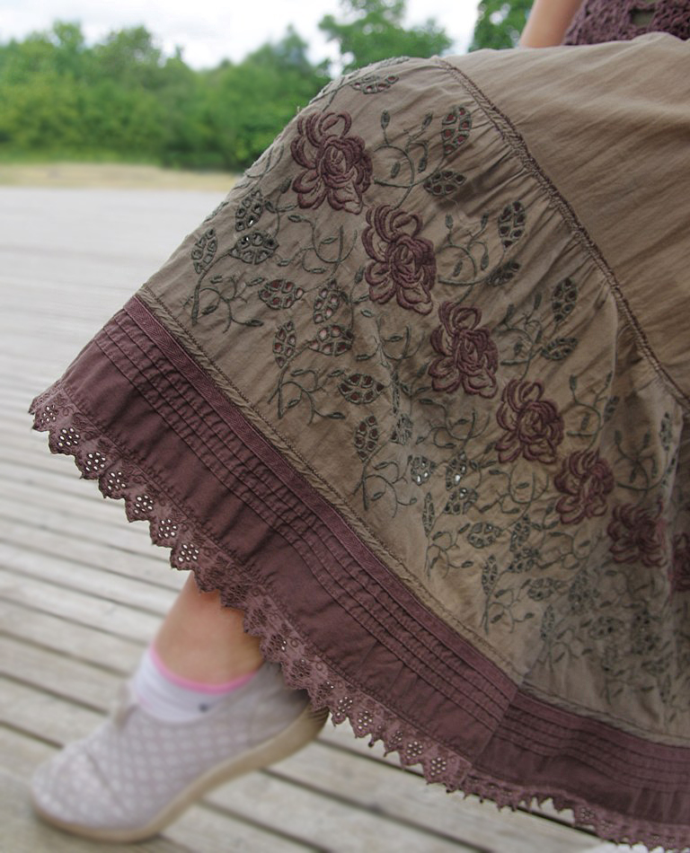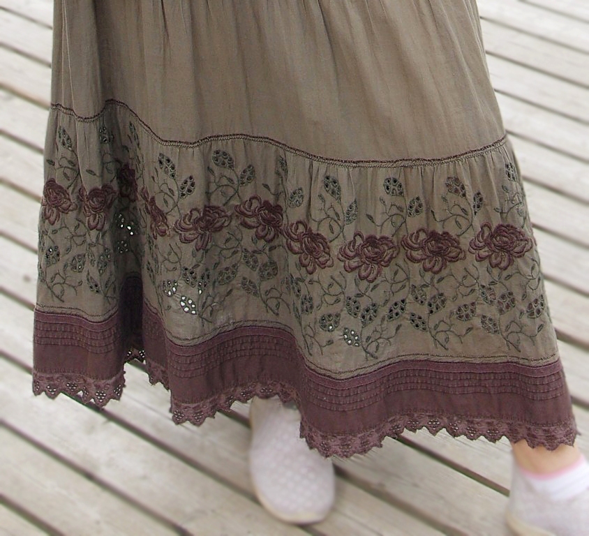 Seelik on alt laienev, kokku õmmeldud kolmest detailist, iga detail õmbluse vahele tihedamalt kroogituna. Särgiku alumine osa langeb volangina lahtiselt seelikule. Vöökohal (särgiku ja seeliku ühendusõmblus) kummipael. Seeliku allosas efektne ja rikkalik broderiitehnikas masintikand, alläär kaunistatud pruuni puuvillase paela, nöörvoltide ja broderiipitsiga.