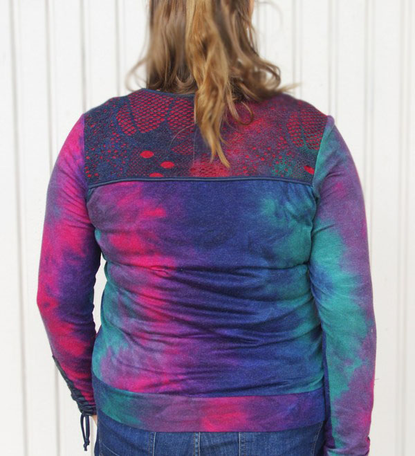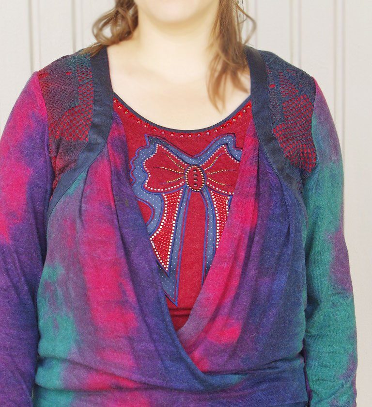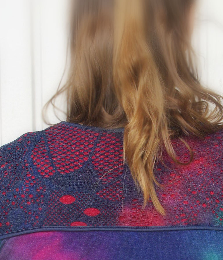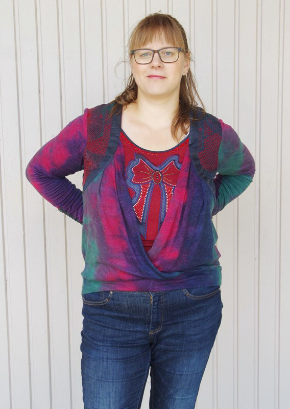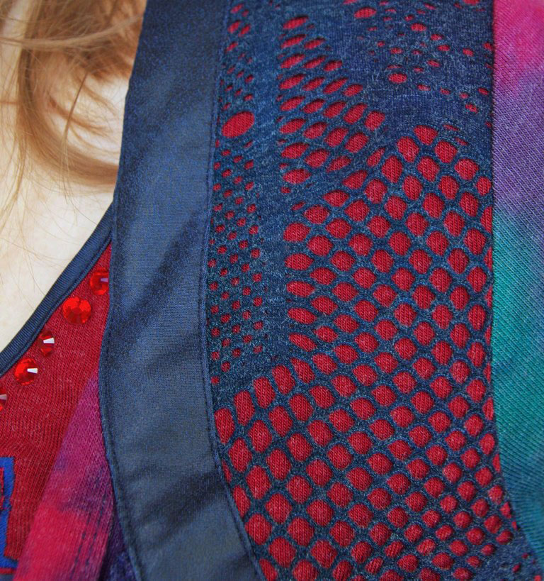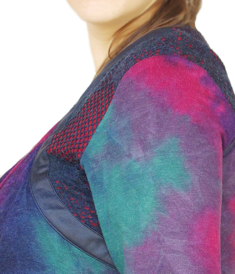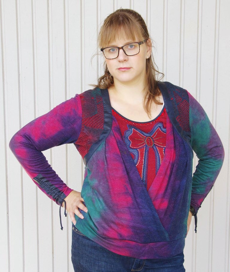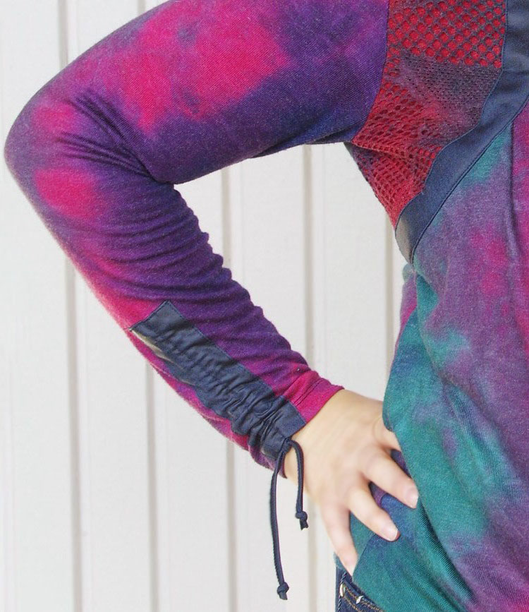 Sinistes-rohelistes-lillades ja fuksiavärvi toonides efektse laigulise trükimustriga pehmest puuvilla- ja viskoosisegu stretštrikotaažist pikkade varrukatega pluus ilukivikeste ja lipsukujulise aplikatsiooniga. Varrukaotstes tumesinisest naha-imitatsiooniga kangast tunnel ja paelad, millega saab varrukaid sobivasse pikkusesse siduda.