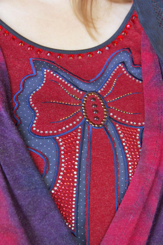 Pluusi passel ees ja taga tumesinisest nahaimitatsiooniga kanga ja pitskanga kombinatsioonis kaunistuselemendid, ees hõlmikuna vabalt langevad voldid. Hõlmiku alla jääval esiosal on kaunistuseks lipsukujuline aplikatsioon, millele on kuumaelemendiga ükshaaval kinnitatud säravad ilukivikesed. Kaeluse äär on rikkalikult kaunistatud suurte punaste sätendavate tšehhi kristallidega.
