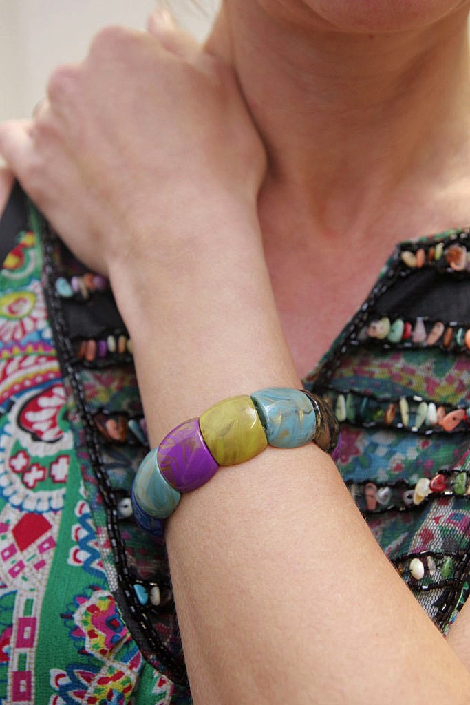 Komplekti kuuluva akrüülhelmestest käevõru laius on 2 cm, sobib randmeümbermõõdule kuni 16,5 cm