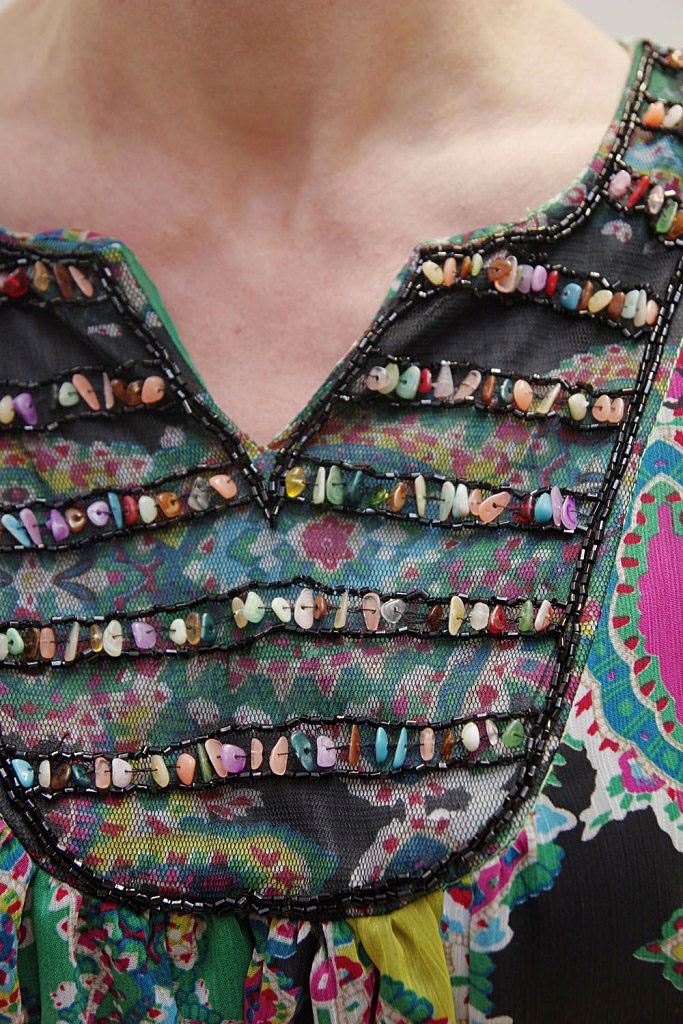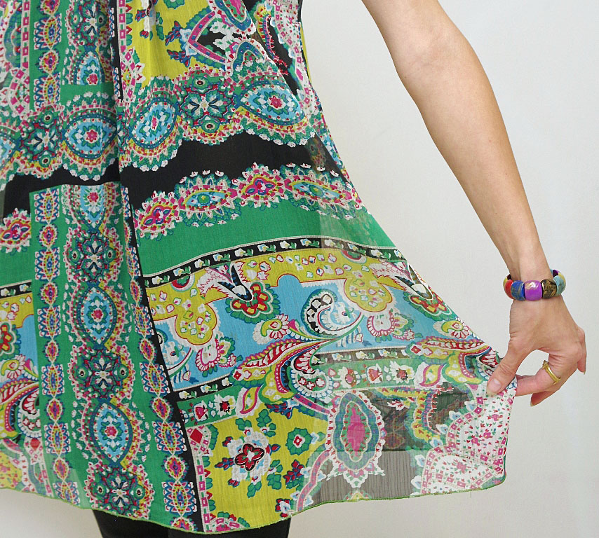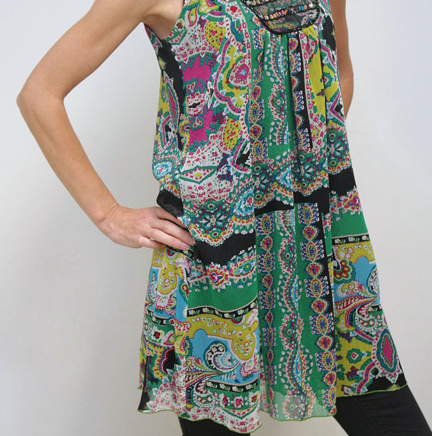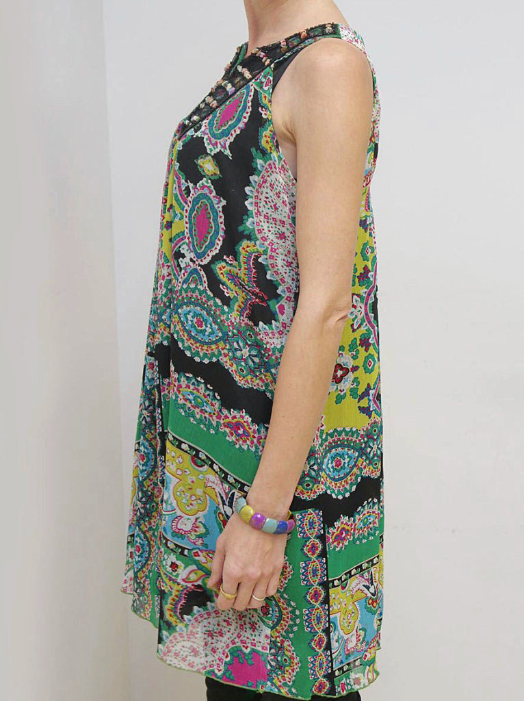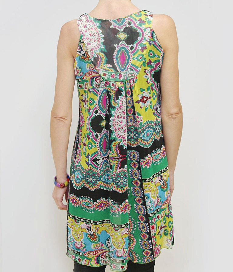 Õhulisest kirjust polüesterkangast alt laienev vöökohata tuunika. Varrukateta tuunika esiosa on rindade alt ja seljalt pisut kroogitud, mistõttu sobib rõiva-ese ka rasedatele. Esiosal kaeluses kaunistuseks mustal tüllil helmestikand.