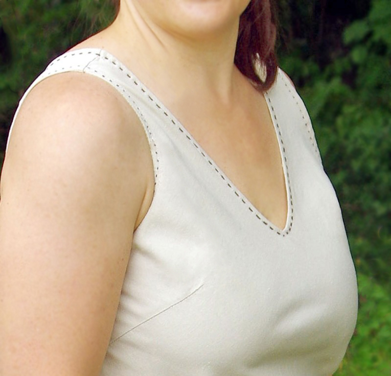 Kleidi V-kaelus, varrukasuud ja kolmnurkne küljeõmblus on kaunistatud tikk-pistes kontrastset pruuni värvi niidiga.