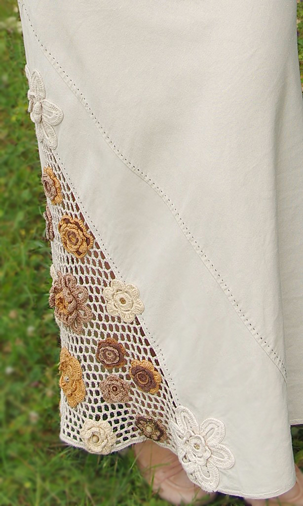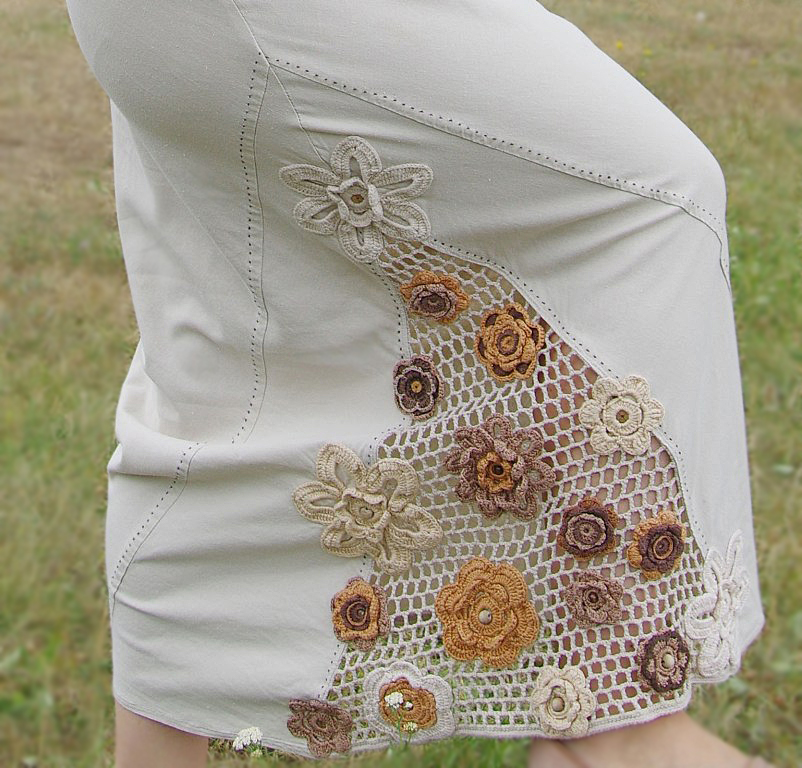Alt kergelt laienev kleit on taljesse töödeldud sissevõtuvoltidega, esiosa ja seljaosa diagonaal-lõikelised ja hästi vormihoidvad (optiliselt ka salendavad). Allääres paremal küljel suur kolmnurkne heegeldatud lillemotiividega kaunistusdetail (käsitsi on heegeldatud nii võrgustruktuuriga alusdetail kui kõik lilled). Lillede südamikeks on käsitsi peale õmmeldud erinevaid puuhelmeid.