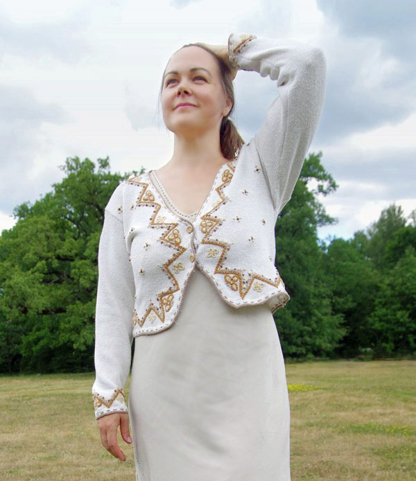 Valgest puuvillasest lõngast kootud kampsuni hõlmad ja varrukaotsad on rikkalikult kaunistatud pruunides toonides efektse tikandiga. Kampsunil on ees kaks naturaalset tooni puidust nööpi. Kampsun on H-lõikeline, üsna lühike ja lai.