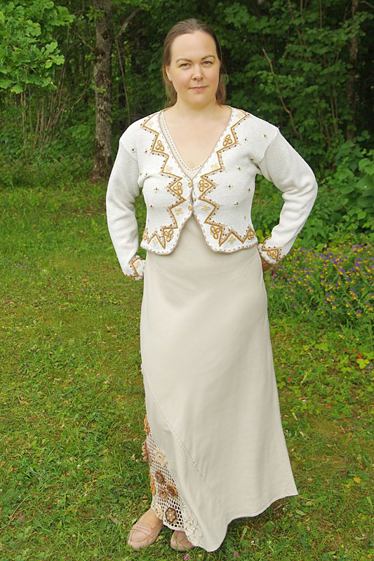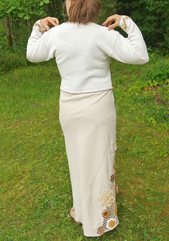Rõivakomplekt valge puuvillasest lõngast kootud lühikese tikitud kampsuni ja naturaalsest (pleegitamata) linasest kangast pika suvekleidiga.
