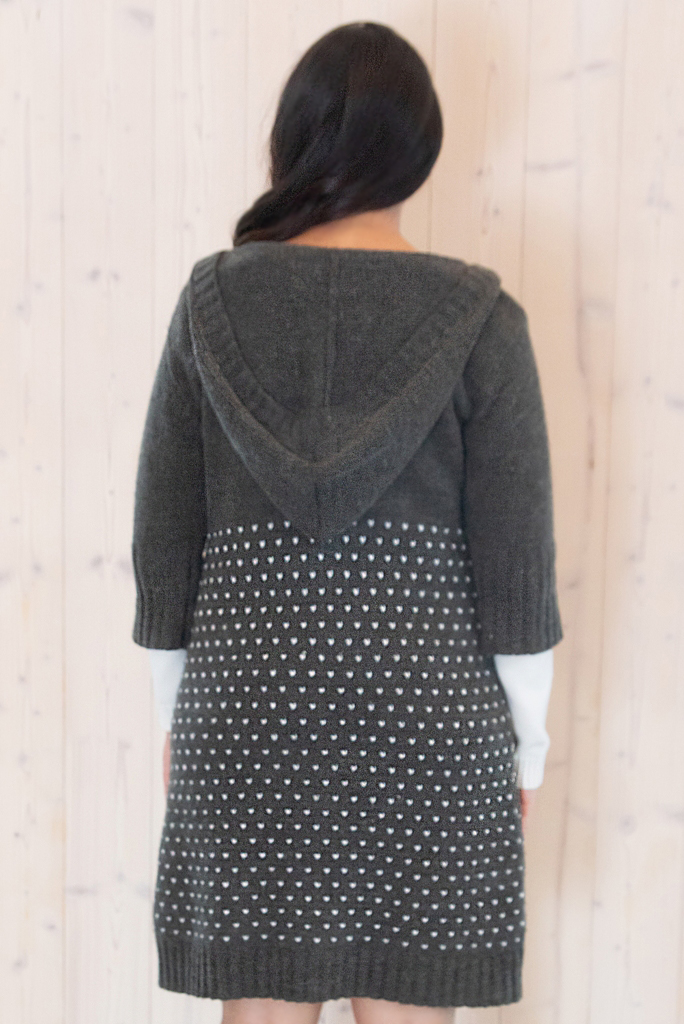 Kleidil on efektne suur kapuuts ja kolmveerandvarrukad. Kapuutsi ääred, V-kaelus, varrukaotsad ja alläär kootud soonikus. Valgeträpsulise koemustriga seelikuosa on alt pisut laienev.