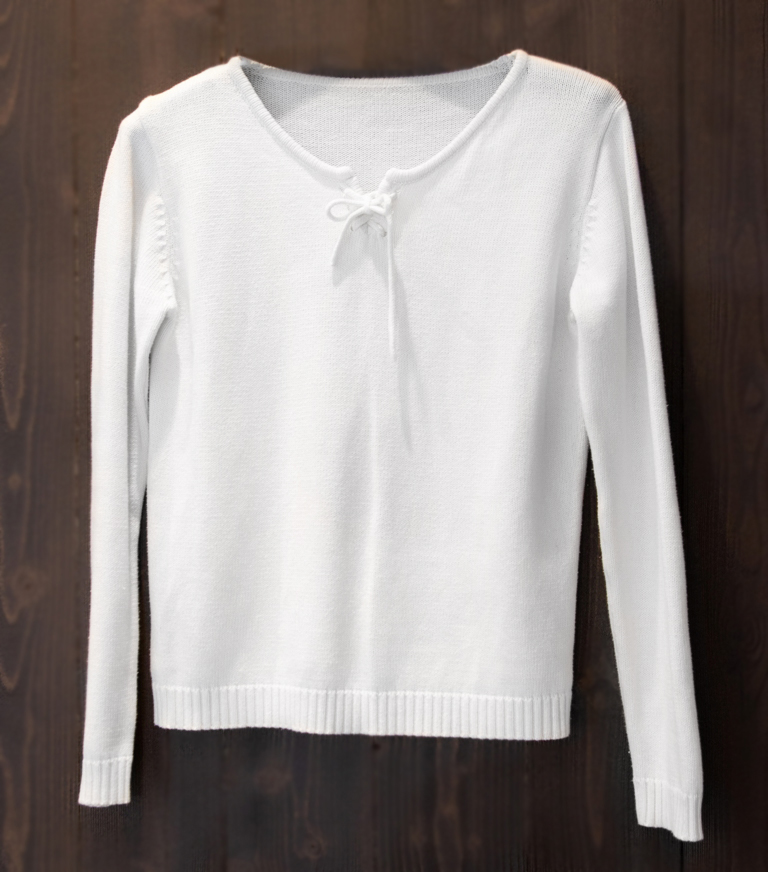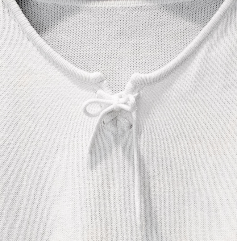 Ümara kaelusega džempril on ees kootud paelast seos. Varrukaotstes ja allääres soonik. Kehaosa sirgelõikeline.