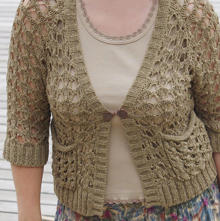 Akrüüli (65%) ja nailoni segu paelast kootud jämedamat sorti koekirjaga raglaanlõikeliste poolvarrukate ja vasevärvi metallkinnisega suvine kampsik.