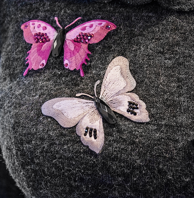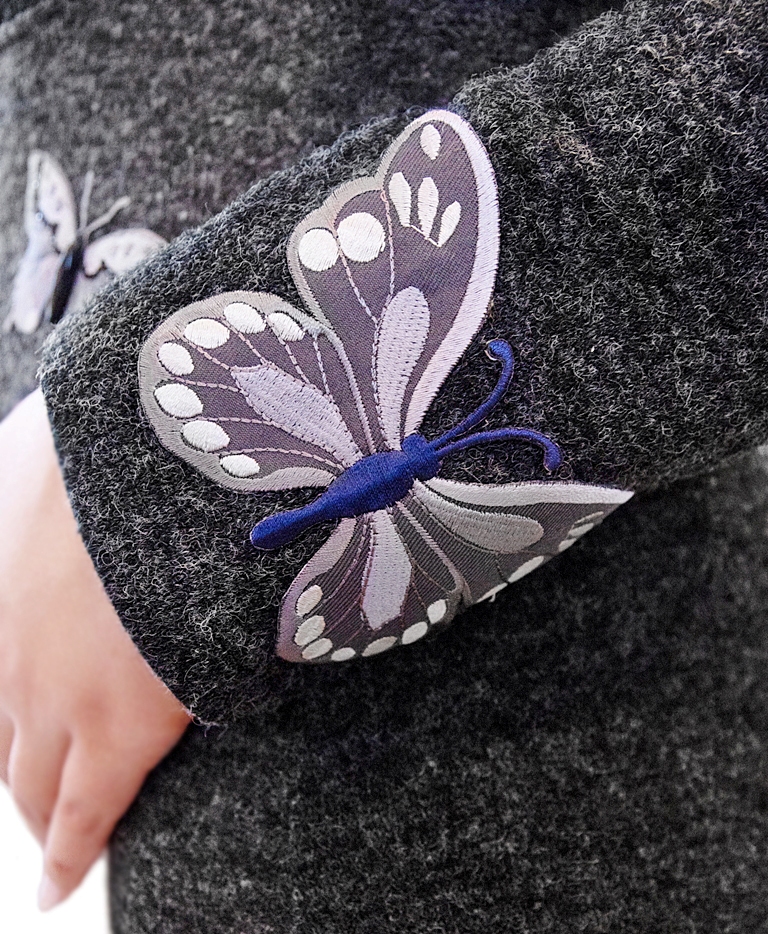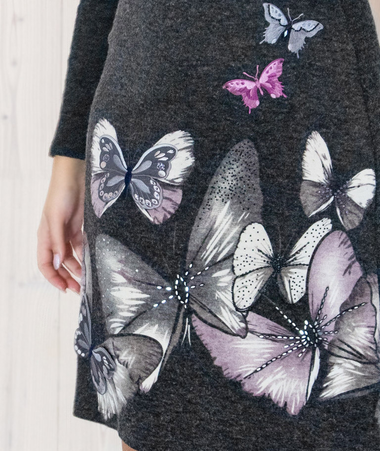 20%-protsendilise villasisaldusega akrüüli (60%) ja polüestri segu peenest tumehallist lõngast suurte liblikamotiividega masinkootud kleit. Kleidi liblikamotiividega trükimuster on rikkalikult kaunistatud käsistsi pealekantud säravate ilukivikeste ja pealeõmmeldud akrüüldetailidega. Esiosa seelikuosale on lisatud reljeefsed masintikandis liblikatest aplikatsioonid. Alumise suure liblika tiivad on jäetud “lendavaks” (aplikatsioon on kleidile kinnitatud ainult liblika keskelt). Liblikatest aplikatsioonid on lisatud ka kleidi rinnaosale ning vasakule varrukale ja õlale.
