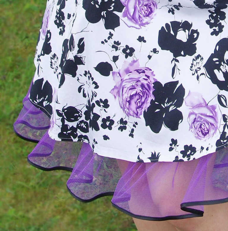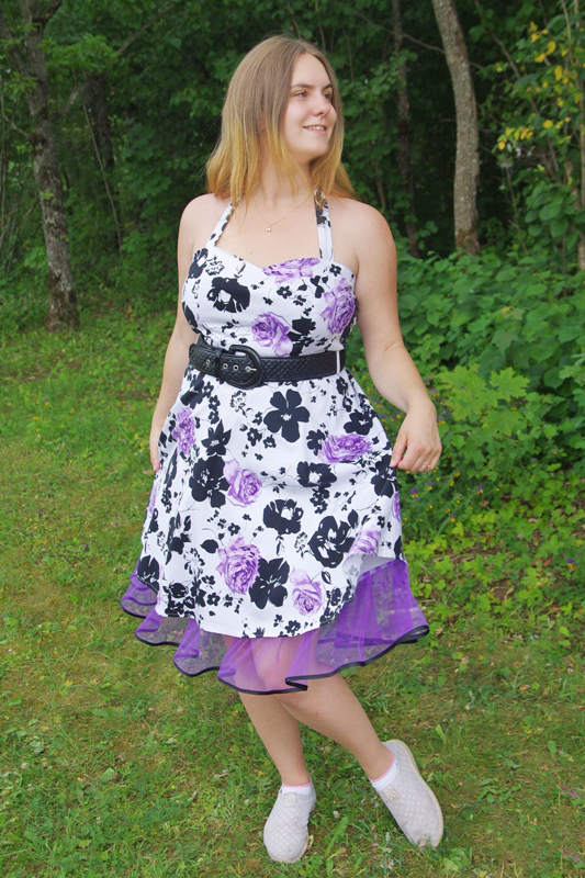 Puuvilla- ja elastaanisegu valgepõhjalisest suurte lillade roosidega hästiistuvast paksemat sorti kangast 50-ndate stiilis suvekleit efektse lilla tülli ja laia musta kunstnahast vööga.