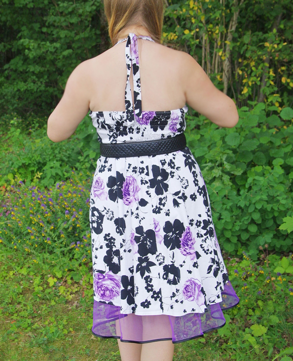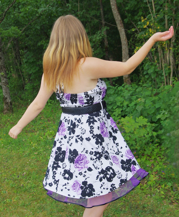 Kleidil on all valgest õhukesest puuvillasest kangast vooder, mille seelikuosa alläärde on õmmeldud efektne lai lillast tüllist volang. Volangi alläär töödeldud kontrastse musta värvi atlasspaelaga. Paremal küljel tõmblukk. Seljaosa istuvuse parandamiseks läbi õmmeldud mitme kumminiidiga. Kaeluses kuklale seotav pael. NB! Kleidi rinnaosa ei ole tugevdatud!