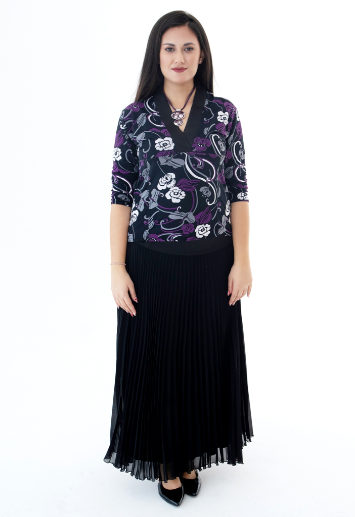 Lilla-valgekirjust lillemustrilisest mustast polüestertrikotaažist kolmveerandpikkuses varrukatega pidulik pluus stiilse kaelaehtega. Pluus on mittekortsuvast ja hästi vormihoidvast stretškangast.
