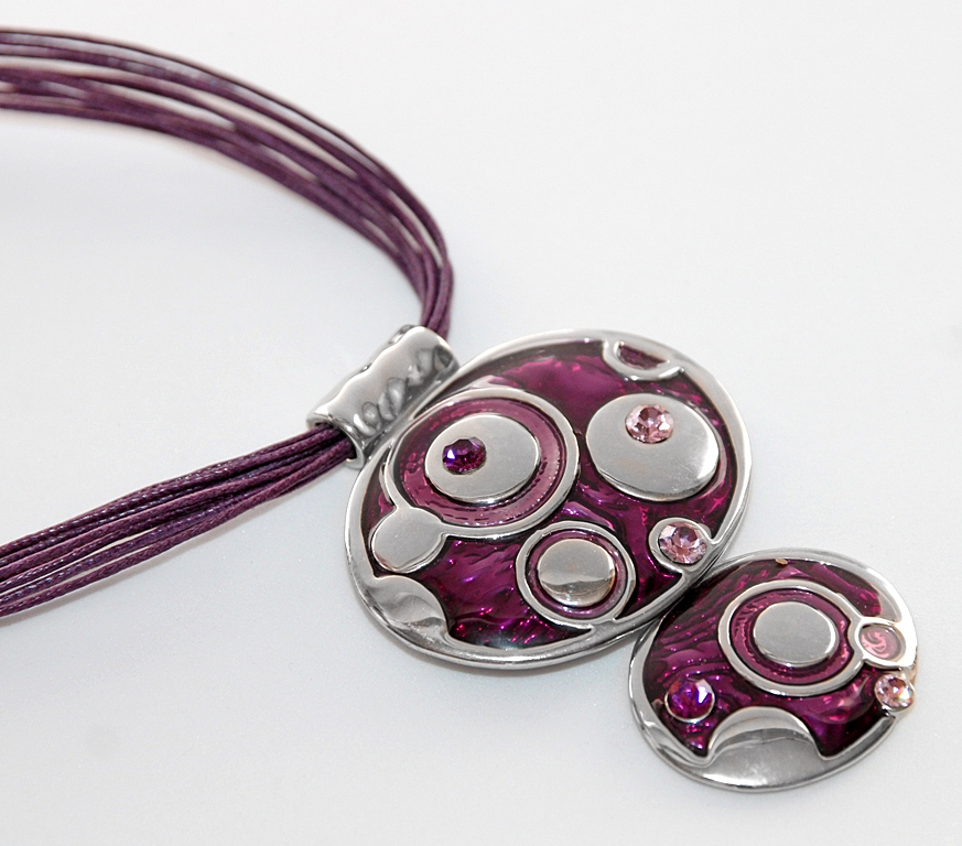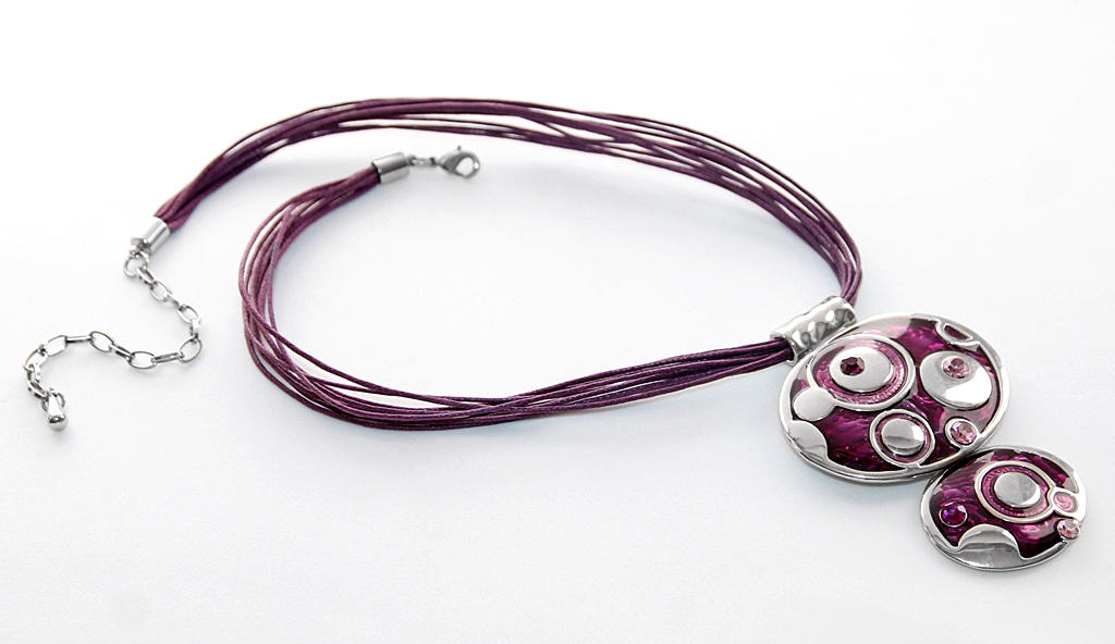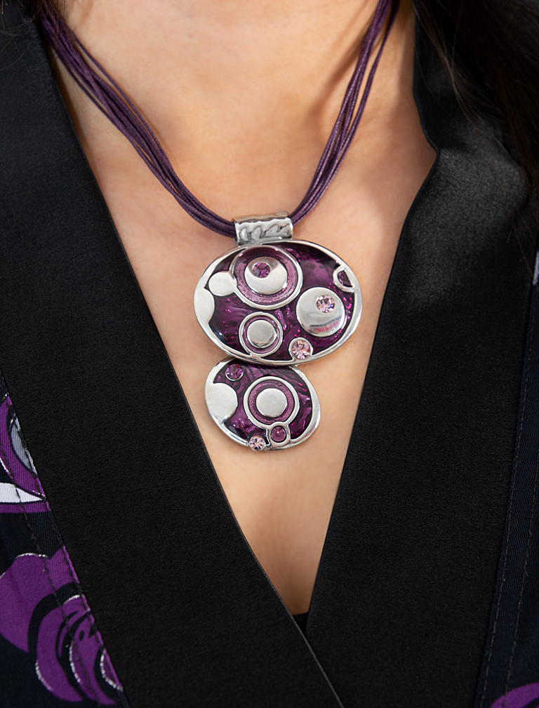 Pluusi kangaga harmoneeruva värvi ja stiiliga mitmekihilise lilla puuvillanööriga kaelaehte pikkus on reguleeritav 40 cm-st kuni 48 cm-ni. Lilla kristallvaigu ja lillakas-roosade klaaskristallidega kaunistatud hõbedavärvi metallripatsi laius on 5 cm ja pikkus 6 cm.