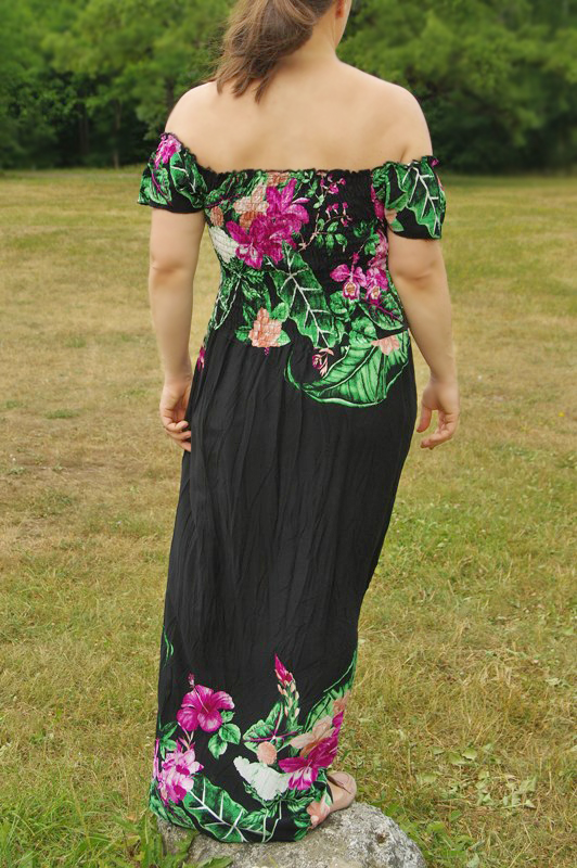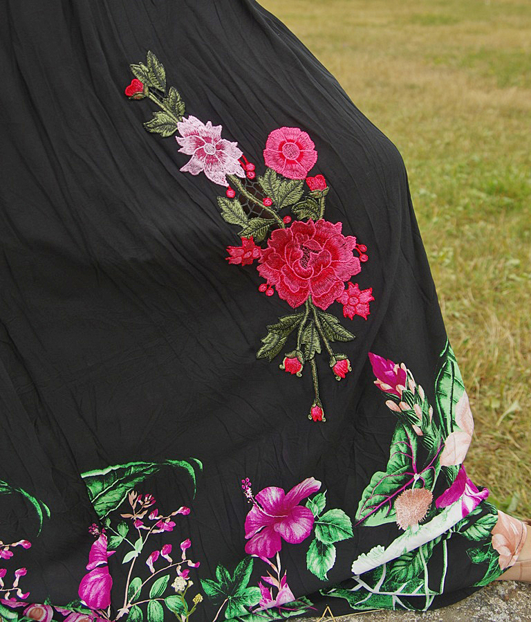 Õhukesest mustapõhjalisest lillemustriga viskooskangast maksikleit efektse aplikatsioontikandi ja kroogitud pihaosaga.