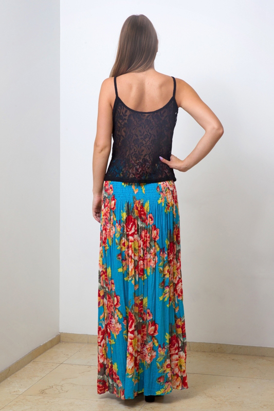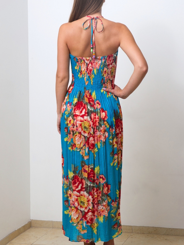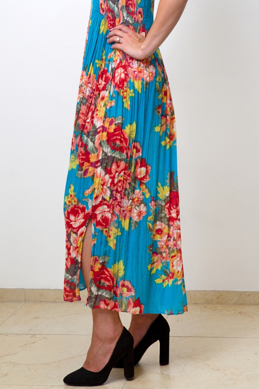 Suurte lillemotiividega erksat meresinist värvi õhukesest täispuuvillasest (batist)kangast suvekleit. Ülemine osa on laialt kumminiidiga läbi õmmeldud. Üle rinna kleiti allapoole tõmmates saab rõivast kanda ka maksiseelikuna. Läbiõmmeldud kummiga osa hoiab kenasti ka ümber talje. Mõlemal küljel on lõhikud.