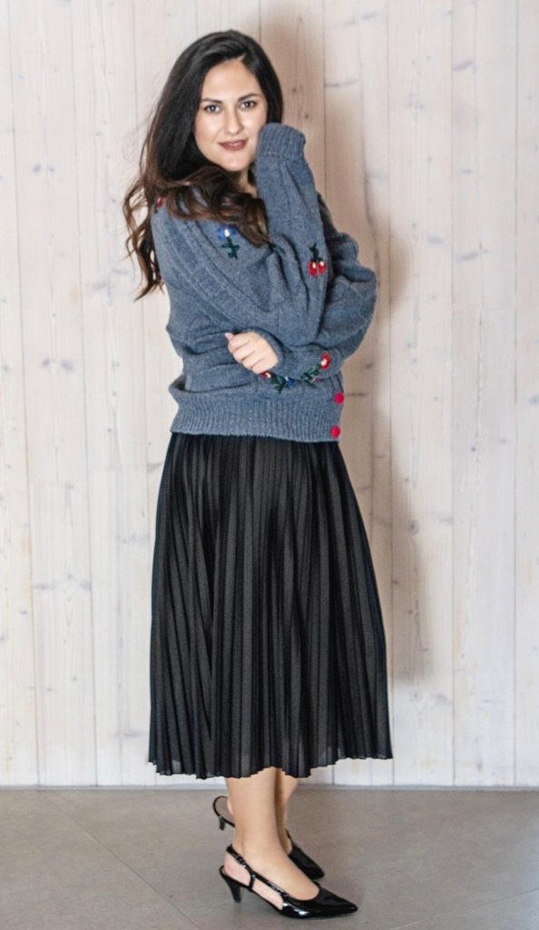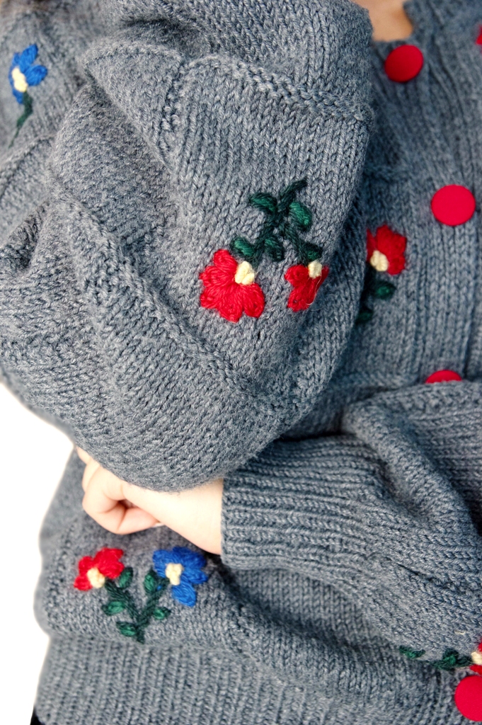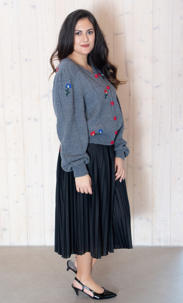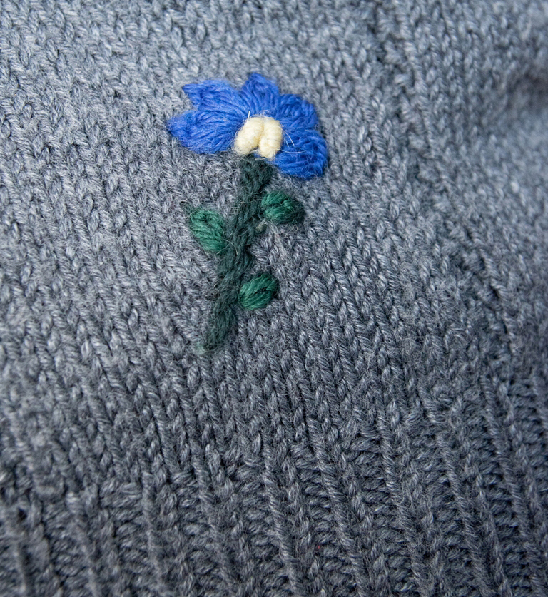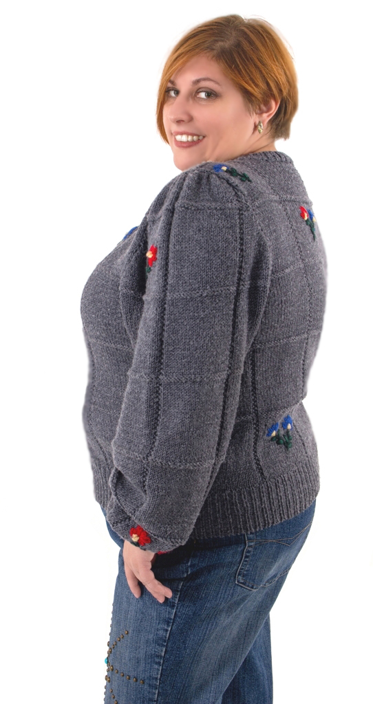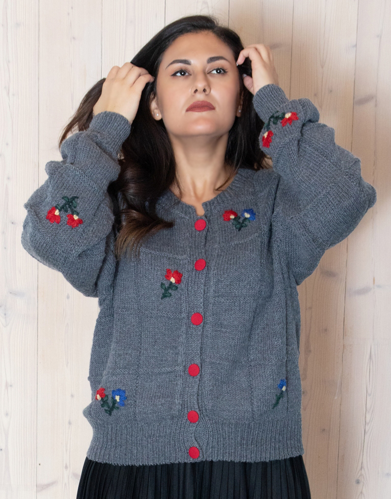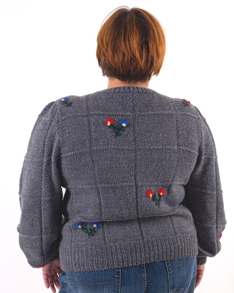 Paksemat sorti hallist villa ja akrüülisegu lõngast käsitsi kootud soe kampsun. Ruudumustrilises koes kampsun on kaunistatud rahvuslikel ainetel lilltikandiga ning punaste tekstiilnööpidega. Kaelus, nööbiliist, varrukaotsad ja alläär on soonik-koes.
