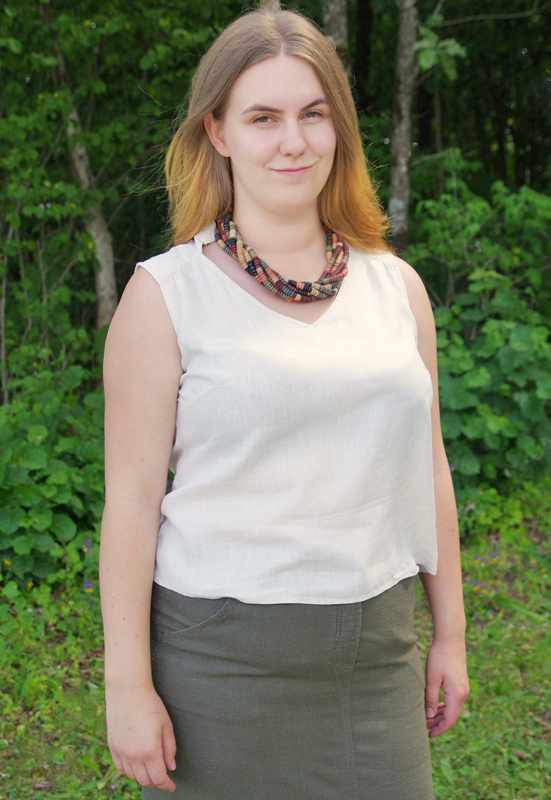 Rõivakomplekt õhukesest naturaalvalgest linasest särgist ja paksemast khakivärvi pikast seelikust suure loodusvärvides kaelaehtega.