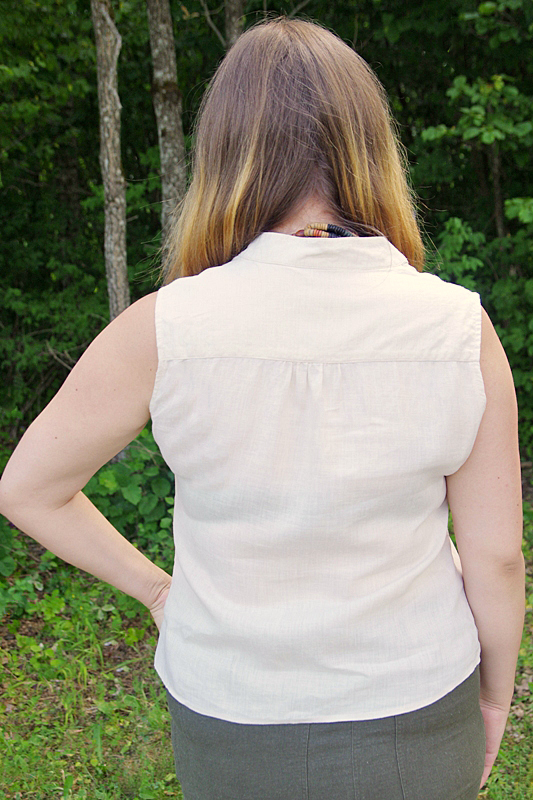 V-kujulise kaelusega linasel särgil on väike püstkrae, seljaosa on avaruse andmiseks passeõmbluse vahelt kroogitud. Särk on sirgelõikeline, rinna sissevõtuvoltidega.