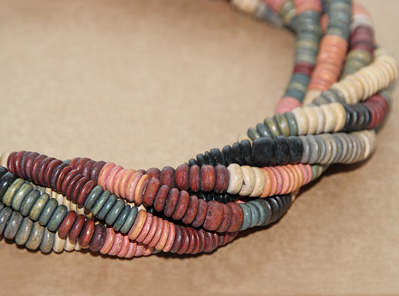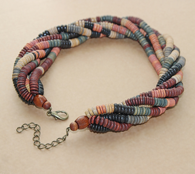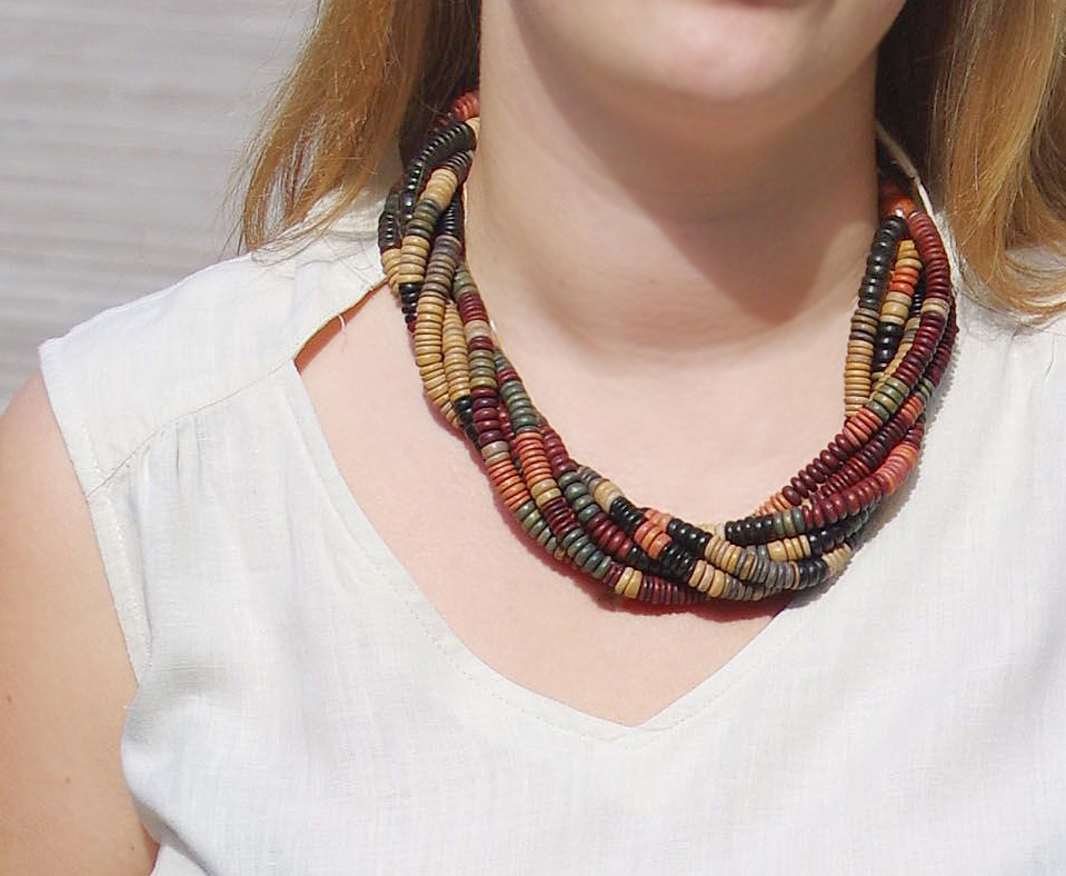 Erinevates loodusvärvides puidust seibidega punutud mitmekihilise kaelakee pikkust on võimalik reguleerida pronksivärvi karabiinhaagi ja pikendusketi abil 50 cm-st kuni 57 cm-ni.