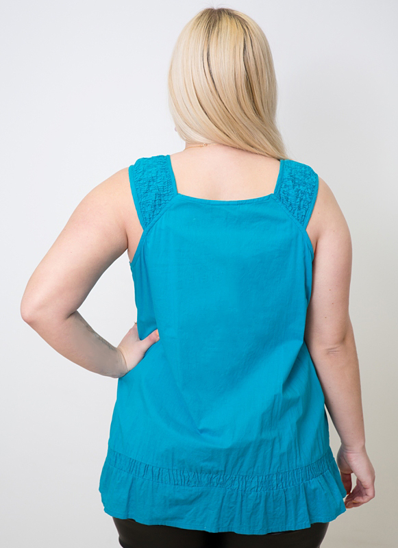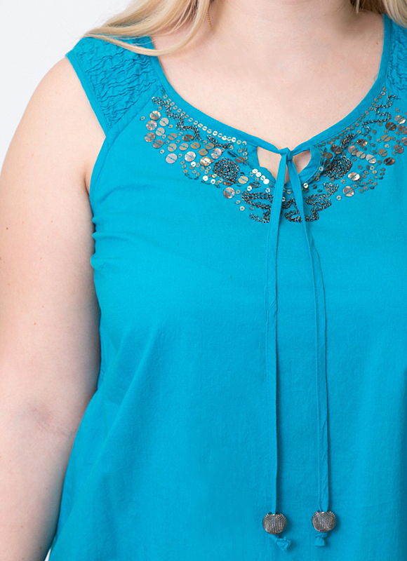 Erksinisest puuvilla ja viskoosisegu õhukesest kangast pikk topp laiade kroogitud õlapaelte ning metallikvärvi litritest ja kettidest efektse tikandiga.