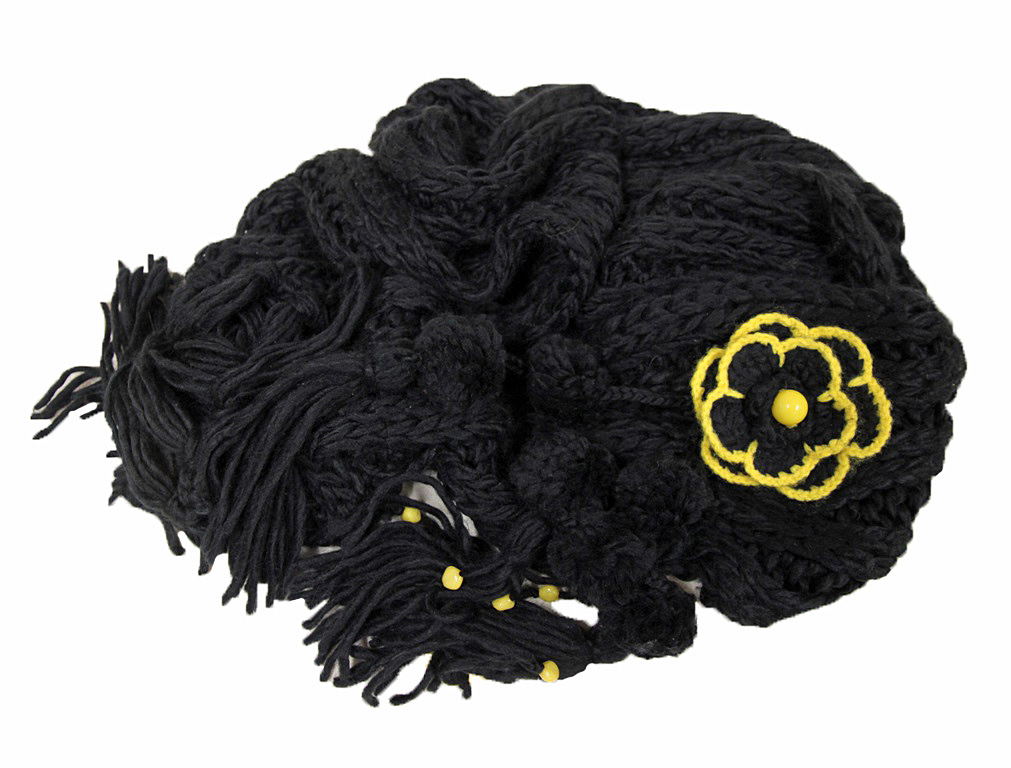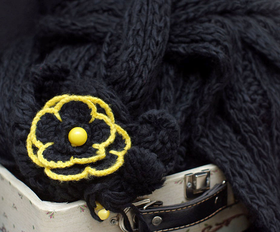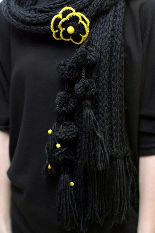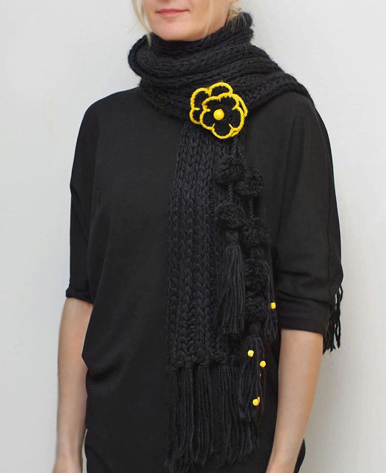 Pehmest süsimustast akrüül-lõngast kootud pikk sall tuttide, kollaste helmeste ja heegeldatud lillega.