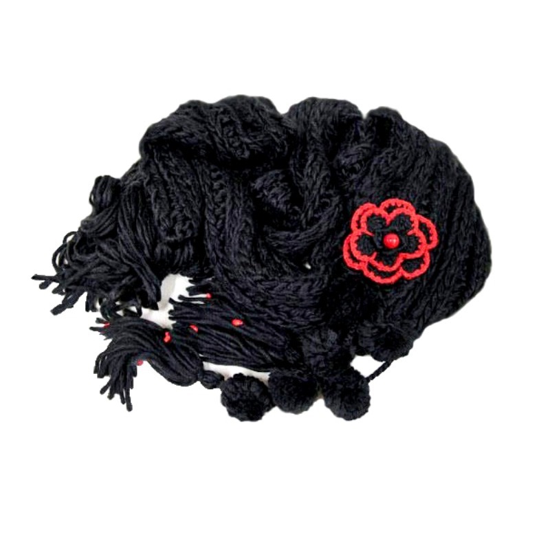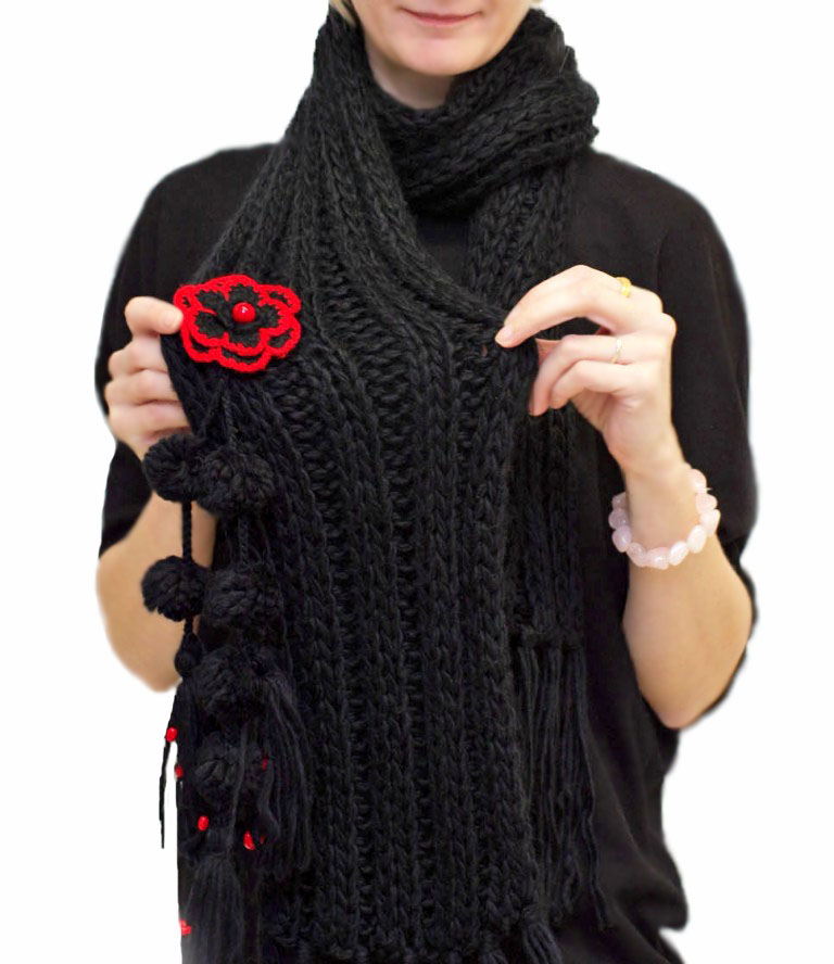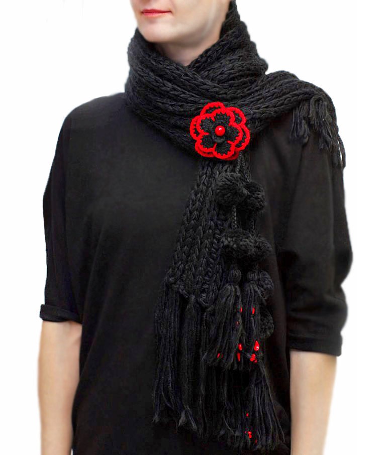 Pehmest süsimustast akrüül-lõngast kootud pikk sall tuttide, punaste helmeste ja heegeldatud lillega.