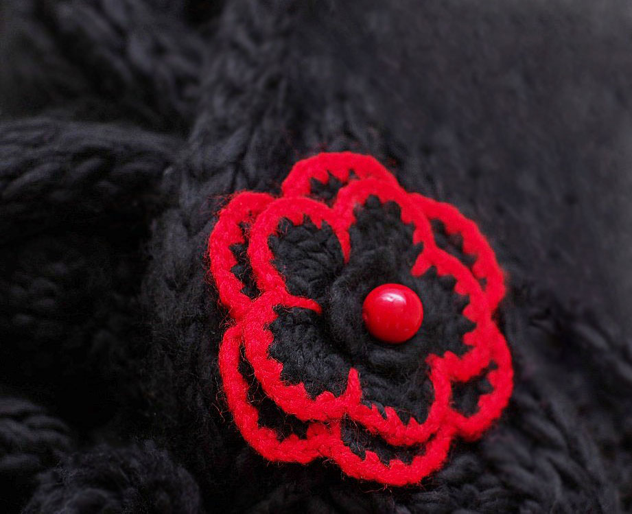 Soonik-koes kootud sall on külgede suunas veniv, salli laius (venitamata) on 15 cm. Mustast lõngast heegeldatud punaste äärtega lille keskel on kaunistuseks suurem punane akrüülhelmes, tuttide otstes olevate narmaste külge on kinnitatud erineva kujuga väikseid punaseid helmeid.