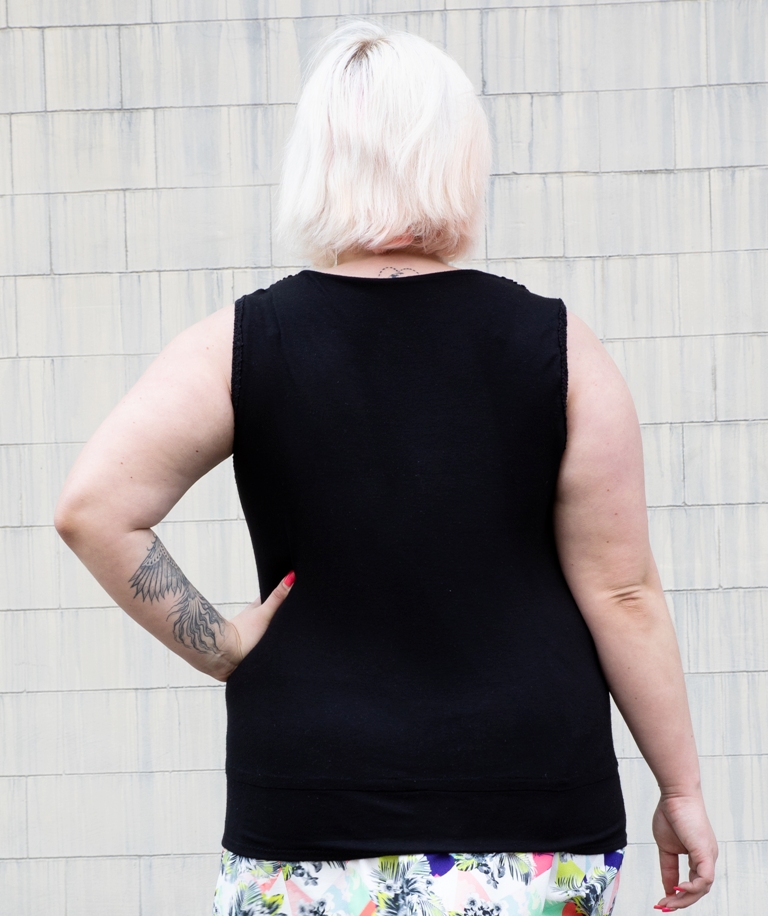 Mustast õhemat sorti puuvilla-elastaanisegu hästilangevast trikotaažkangast ümara kaelusega varrukateta “maika” tüüpi särgik.