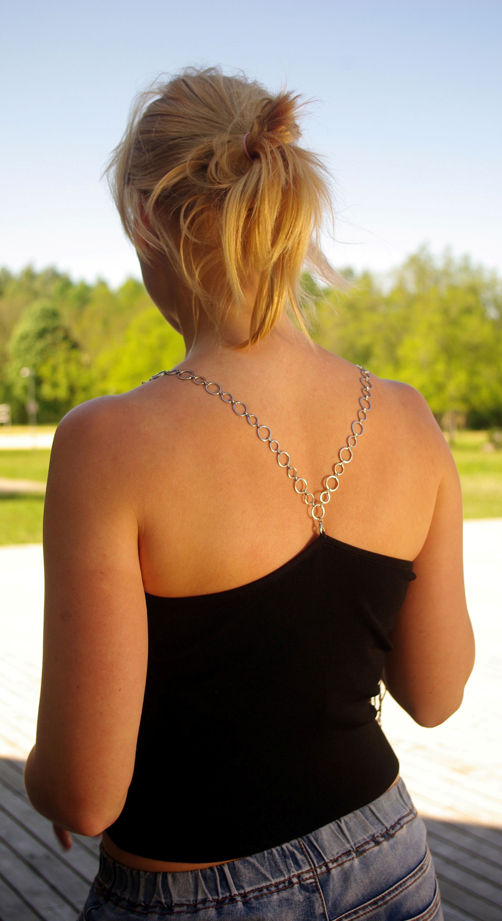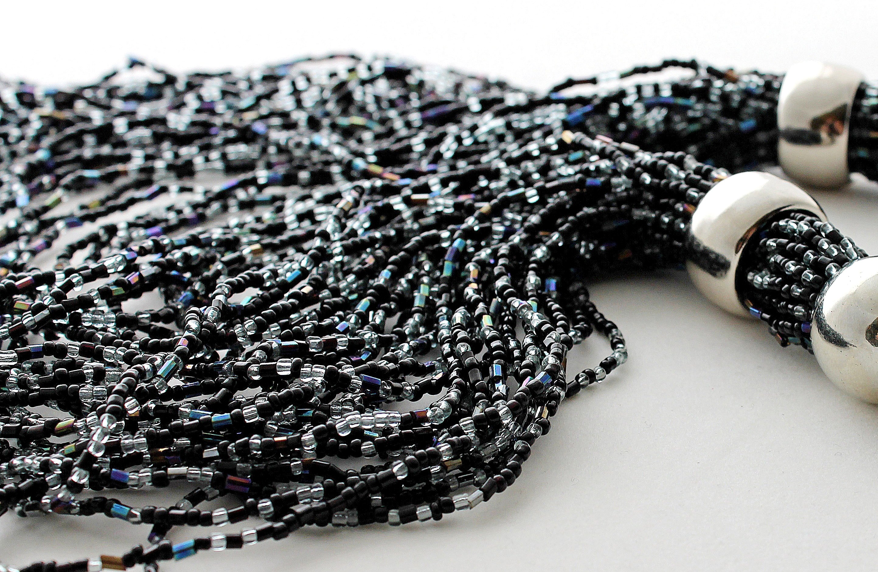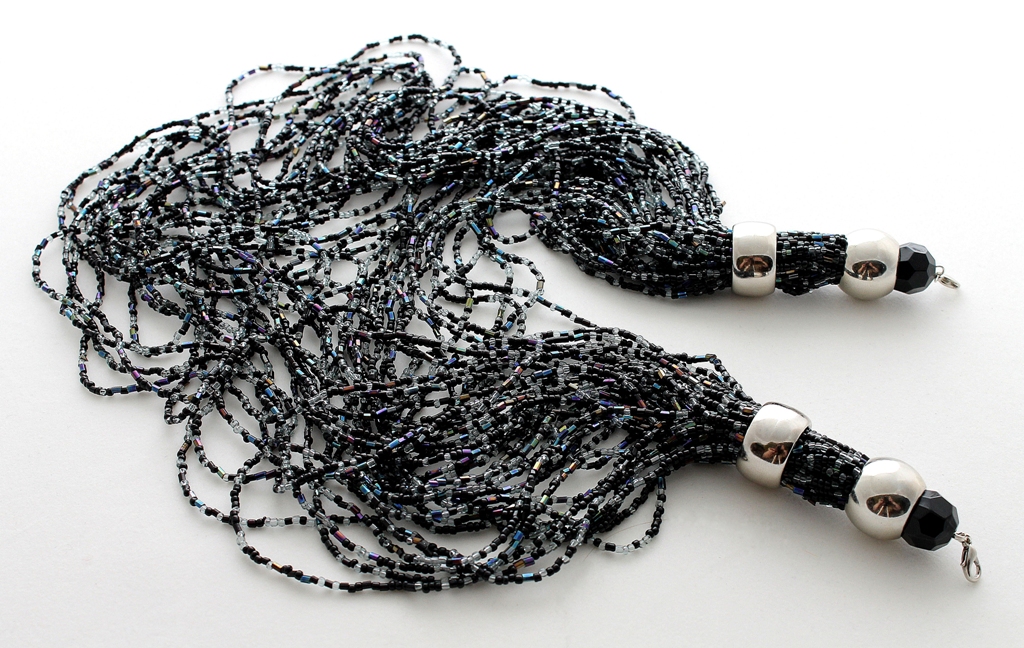 Siidiselt pehme viskoosi (75%) ja nailoni (25%) segu lõngast masinkootud lühike topp metallrõngastest õlapaelte ja sädelevatest mustadest seemnehelmestest keega. Efektne mitmekihiline helmekee kinnitub õlapaeltest rõngaste külge kahe karabiinhaagiga ja on kergesti lisatav / äravõetav. Hõbedavärvi metallrõngastest õlapaelad kinnituvad särgiku külge samuti väikeste karabiinhaakidega, et neid saaks pesemise ajaks eemaldada.