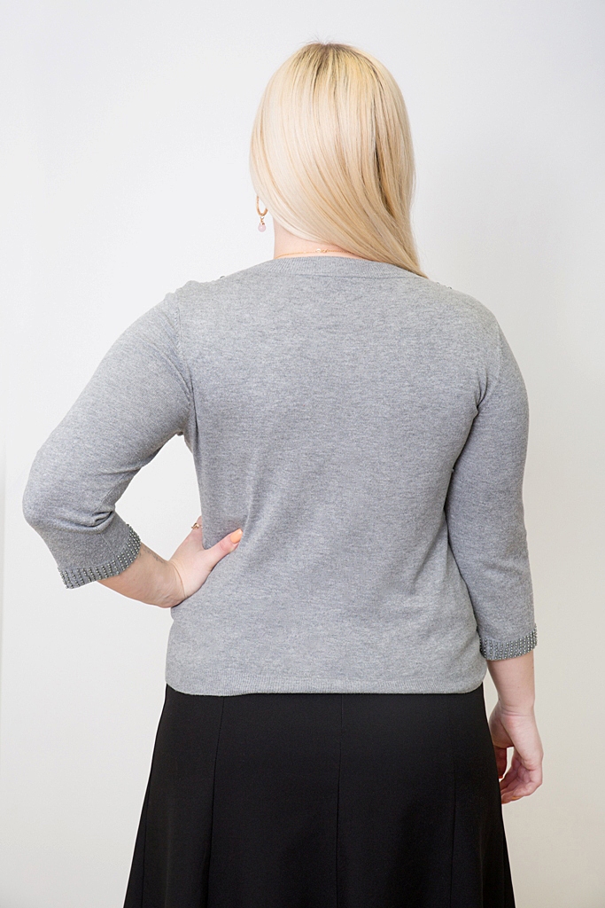 Erineva suurusega halli värvi akrüülpärlitest ja väikestest klaashelmestest tikandiga on kaunistatud džempri ümara ja üsna avara kaeluse esiosa. Väikeste hallide akrüülpärlitega on kaunistatud ka varrukaotsad.