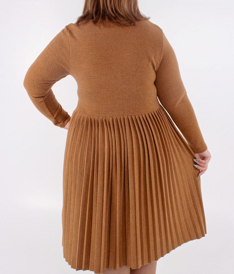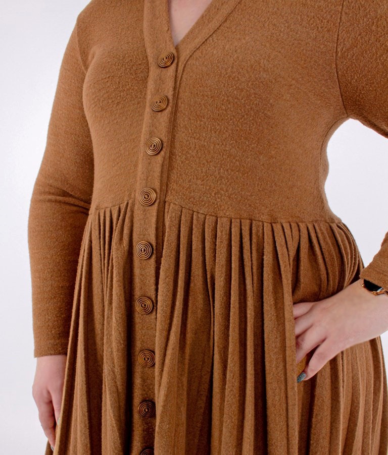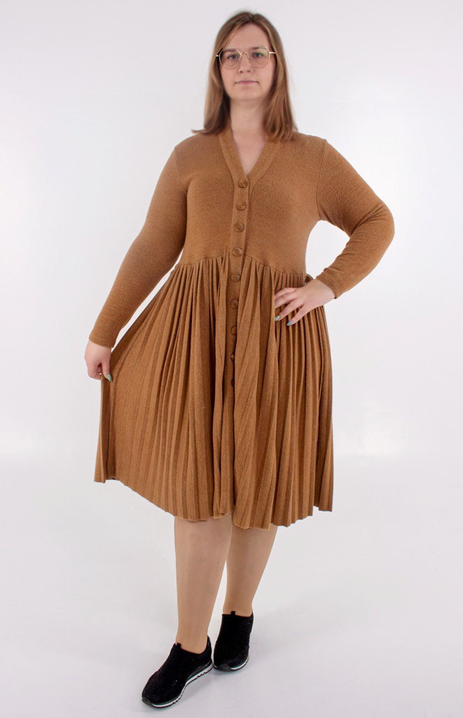 Kollakaspruunist mõnusalt pehmest viskoosi-, elastaani- ja akrüülisegu lõngast pikkade varrukatega trikotaažkleit plisseeritud seeliku ja kaunistusnööpidega. Trikotaažkanga alumine osa on siledakoeline, pealmine osa kergelt karvastatud.