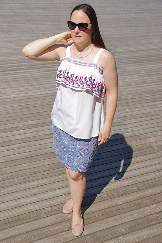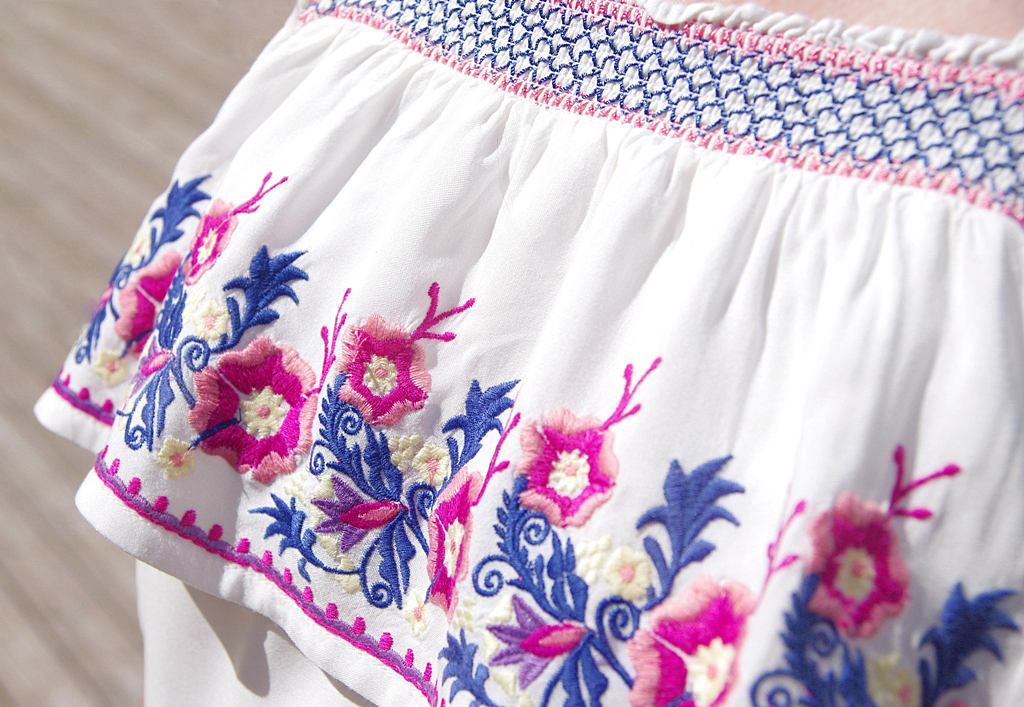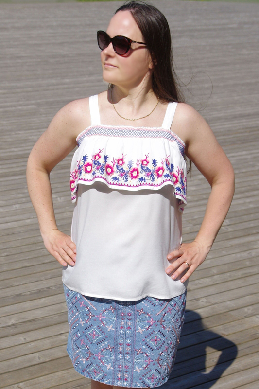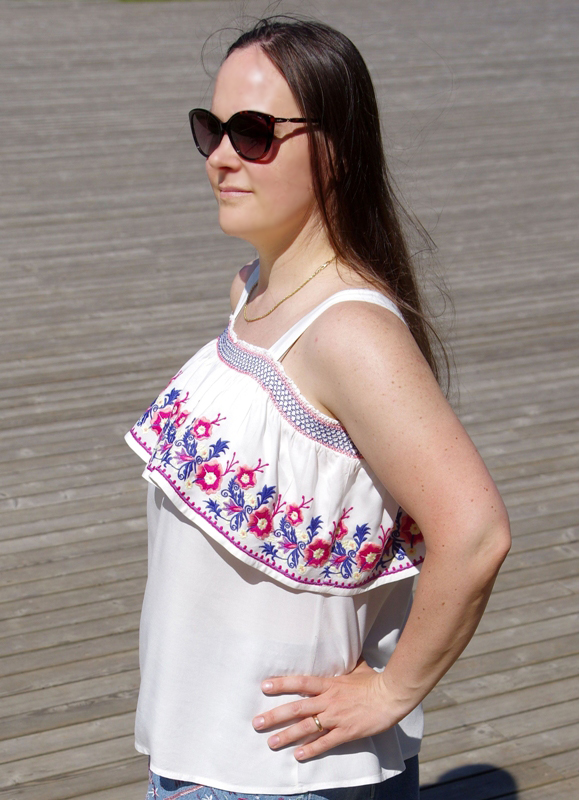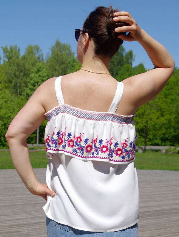 Valgest viskooskangast suvine top õlapaelte ja rahvuslikel motiividel masintikandiga kaunistatud efektse suure volangiga. Õlapaelte pikkus ei ole reguleeritav.